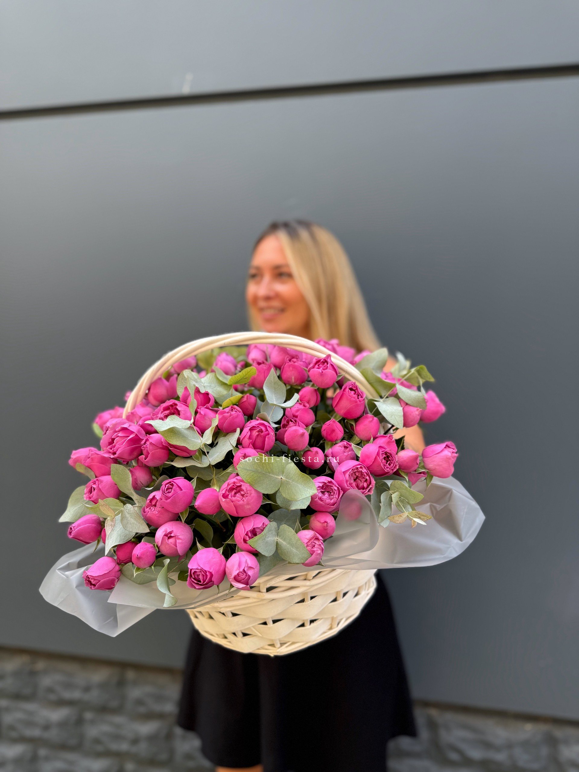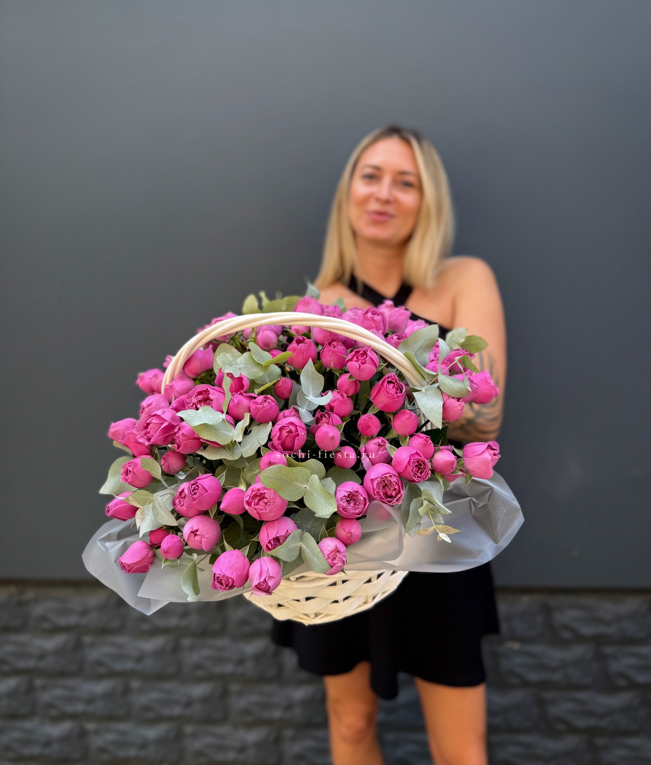 Двести одна роза глубокого красного оттенка собрана в просторной корзине. Плотное заполнение создает цельную бархатистую поверхность, где каждый бутон дополняет соседний. Масштабная композиция для выражения самых сильных чувств.