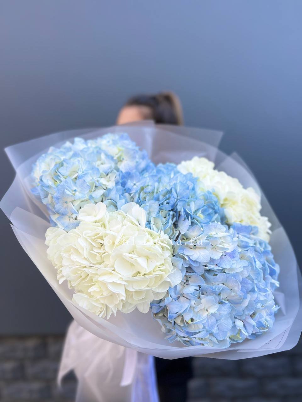 Воздушная палитра белого с голубыми переливами дарит ощущение прохлады и свежести. Пять соцветий гортензии образуют мягкую композицию, где каждый оттенок перетекает в другой, создавая глубину.