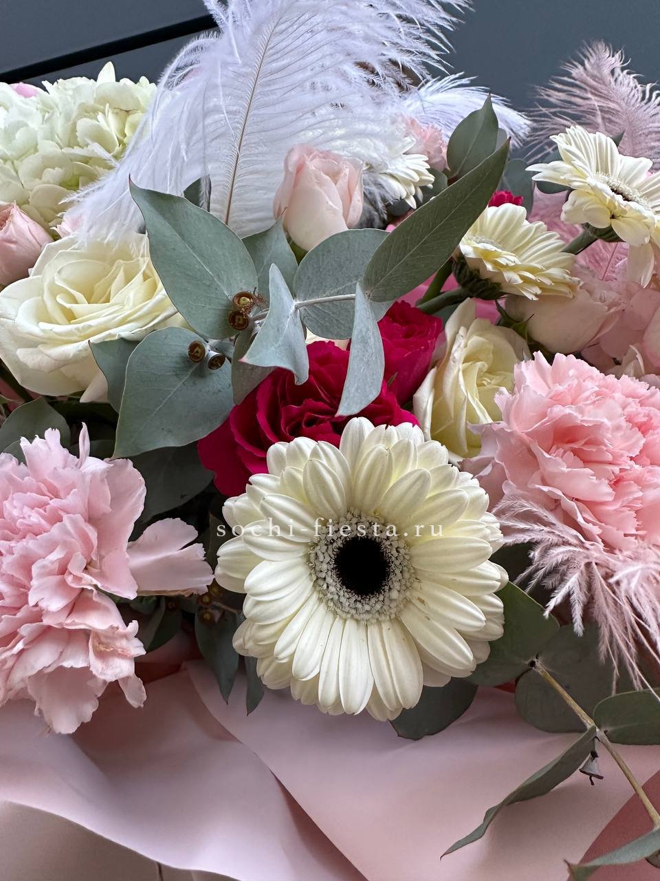 гортензия, розы, протея, озотамнус, орхидея, пионовидные кустовые розы различных сортов, эустома, листья стрелиции (или аналог), аспарагус, эвкалипт, деревянный бокс Готовая композиция может иметь незначительные внешние отличия от примера на фотографии, вместе с тем, сохранит гамму и фактуру.