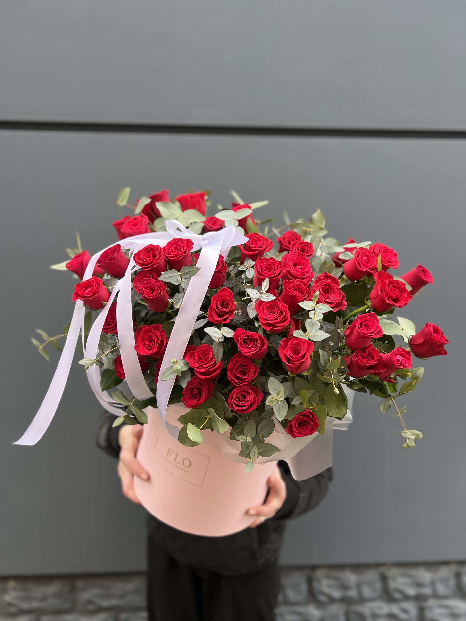 Пышная композиция объединяет крупные соцветия гортензии с бархатными розами и воздушной эустомой. Мисти бабблс и диантус создают мягкую дымку вокруг центральных бутонов. Веточки эвкалипта добавляют свежести и завершают образ.