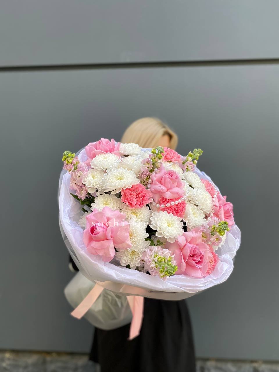 Хризантемы и розы соединяются с диантусами и маттиолой в яркой композиции. Декоративные бусины вплетаются в оформление и задают игривое настроение всему букету.