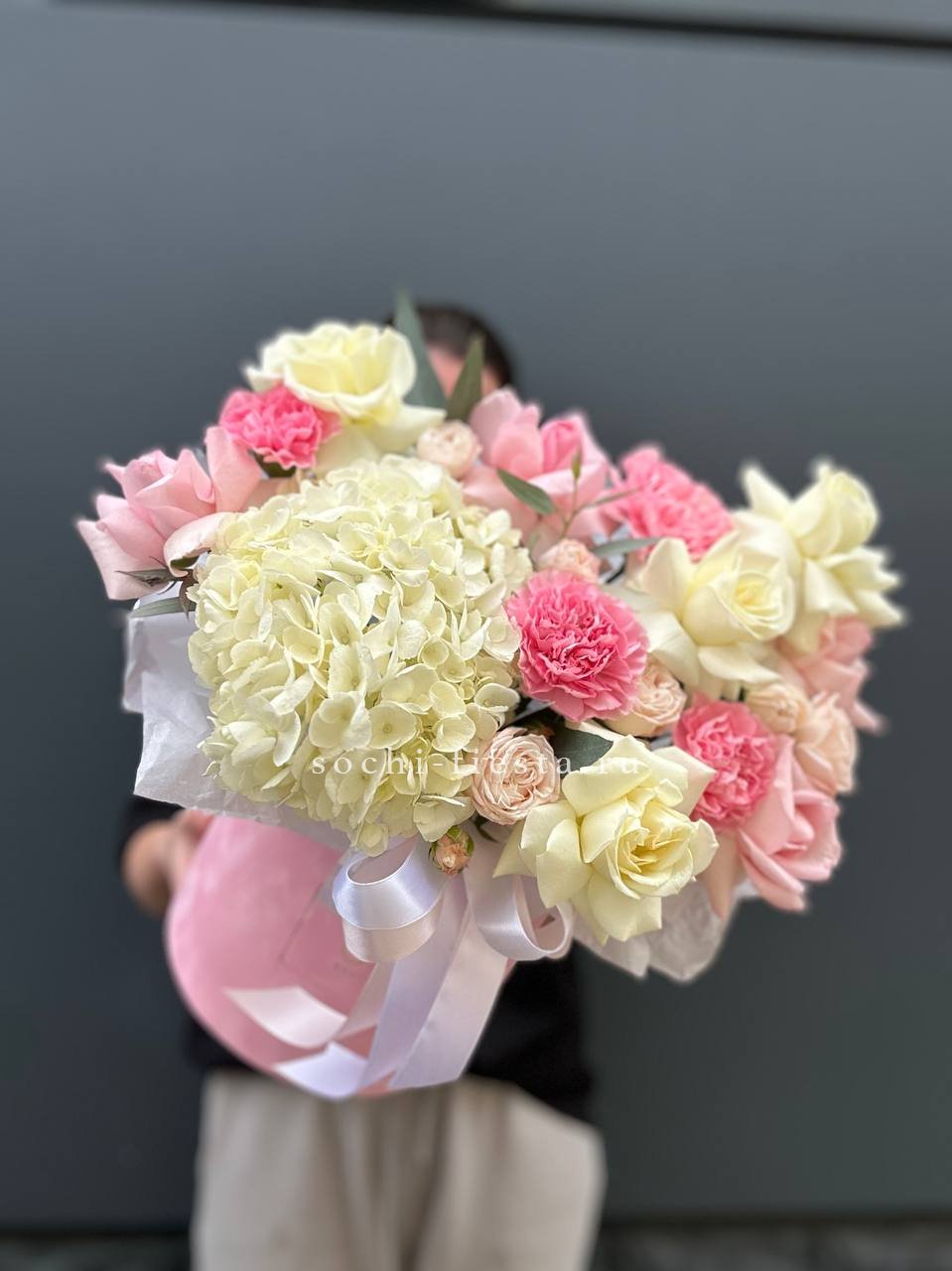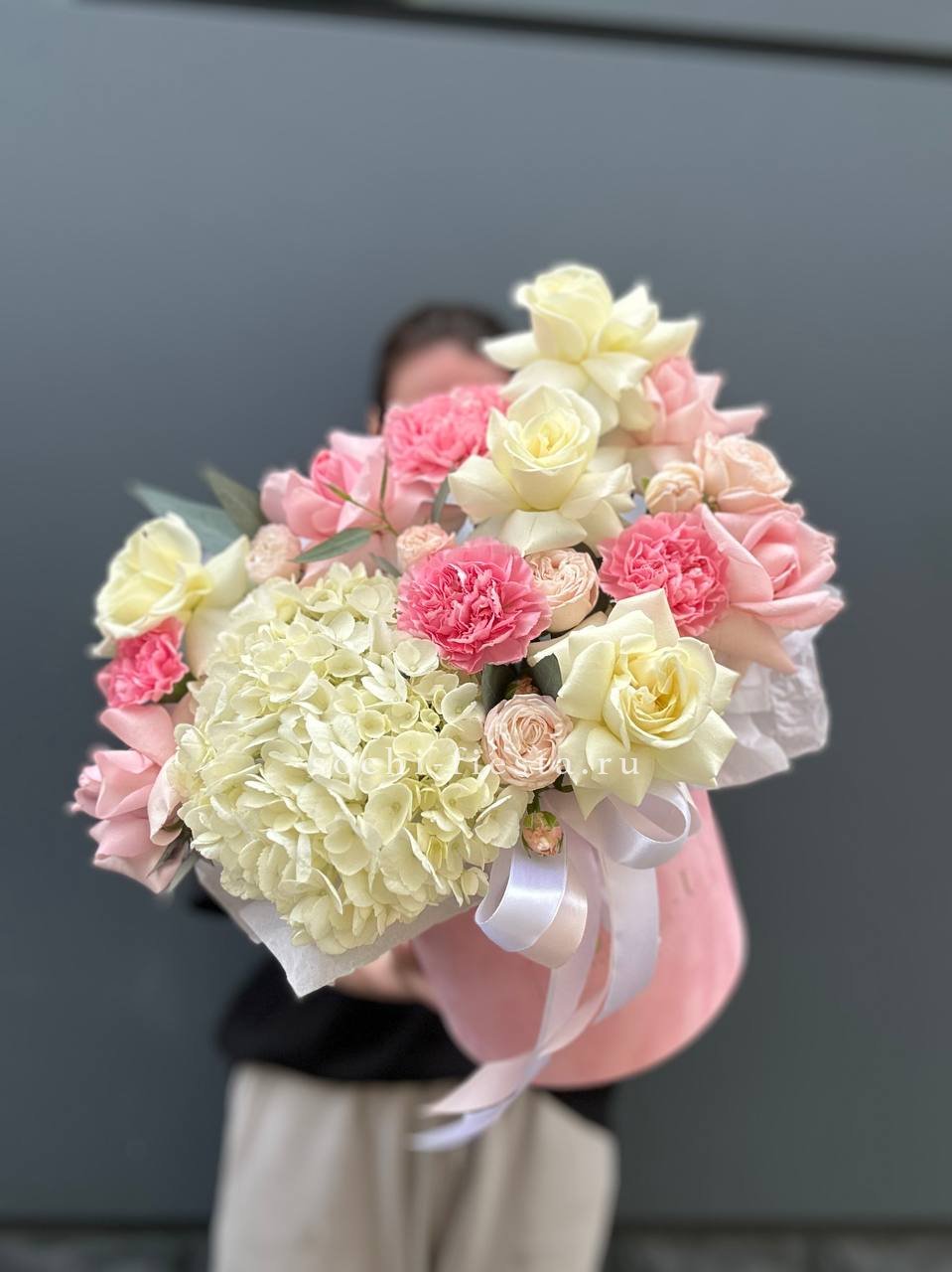Сочетание пышной голубой гортензии и классических белых роз — это гимн нежности и чистоты. Букет, который не просто удивляет своим масштабом, но и дарит ощущение безмятежности. Идеальный выбор для самого искреннего признания.