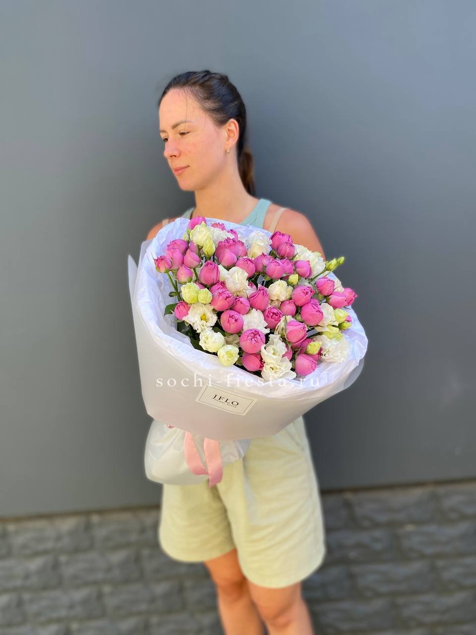 Пионовидные розы раскрываются густыми лепестками, хамелациум добавляет воздушности. Композиция держит форму и долго сохраняет свежесть.