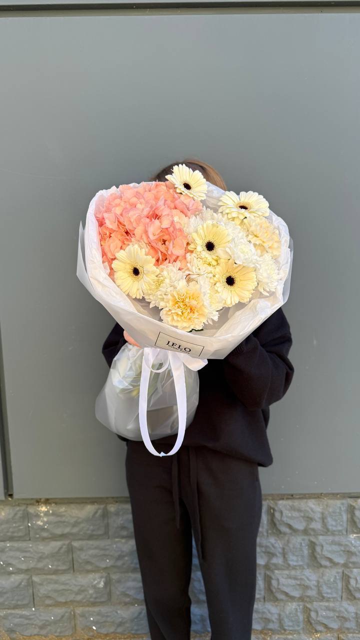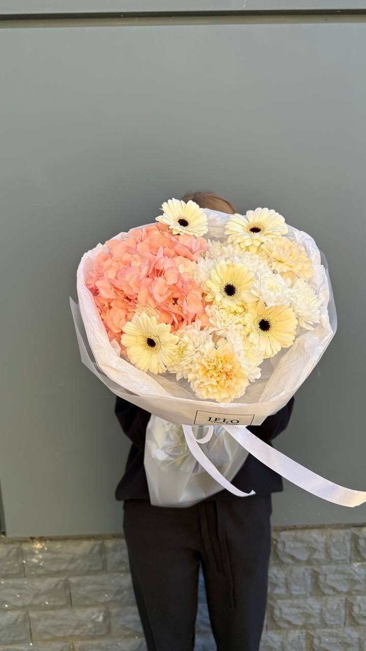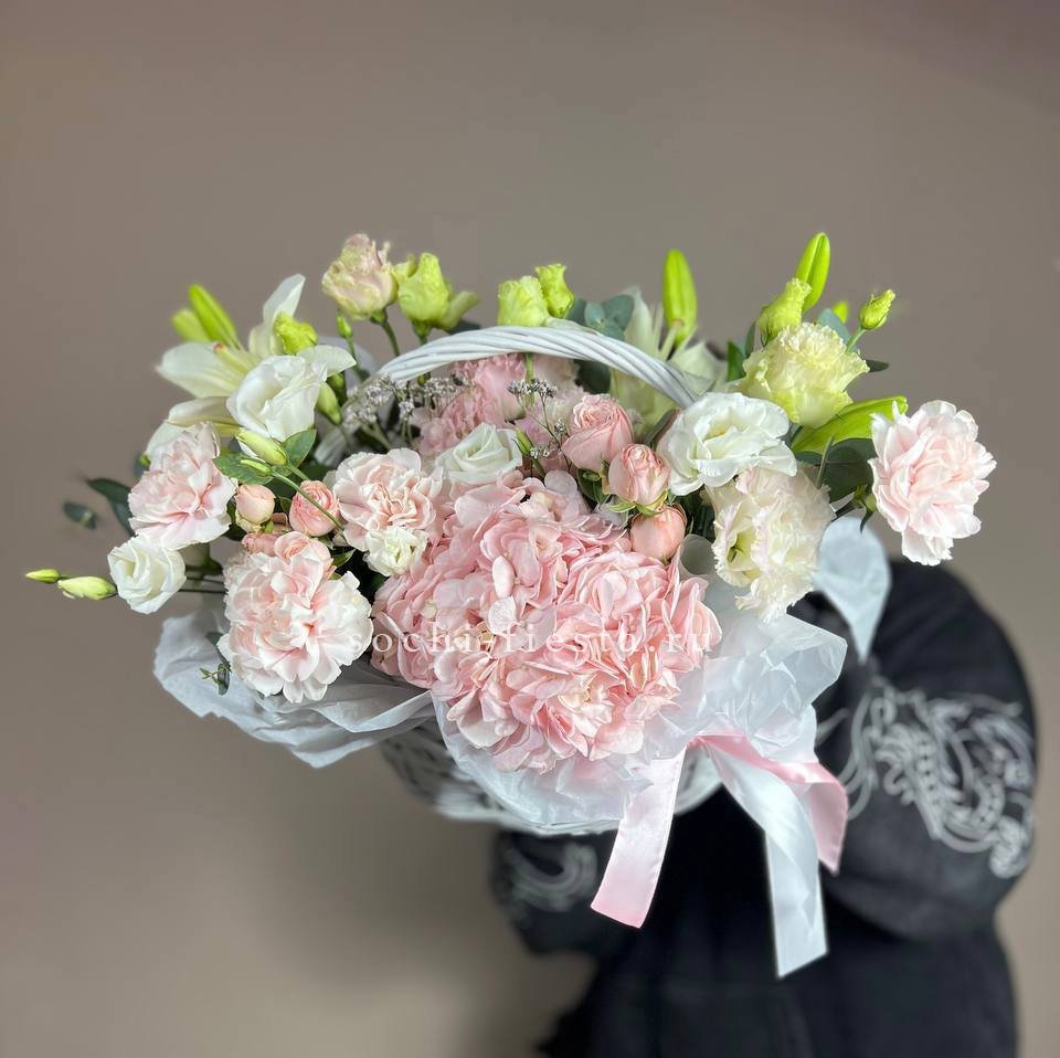 Пышная гортензия задаёт основной объём, а мелкие соцветия мисти баблс создают лёгкую дымку вокруг. Диантус и озотамнус дополняют фактуру мягкими переходами.
