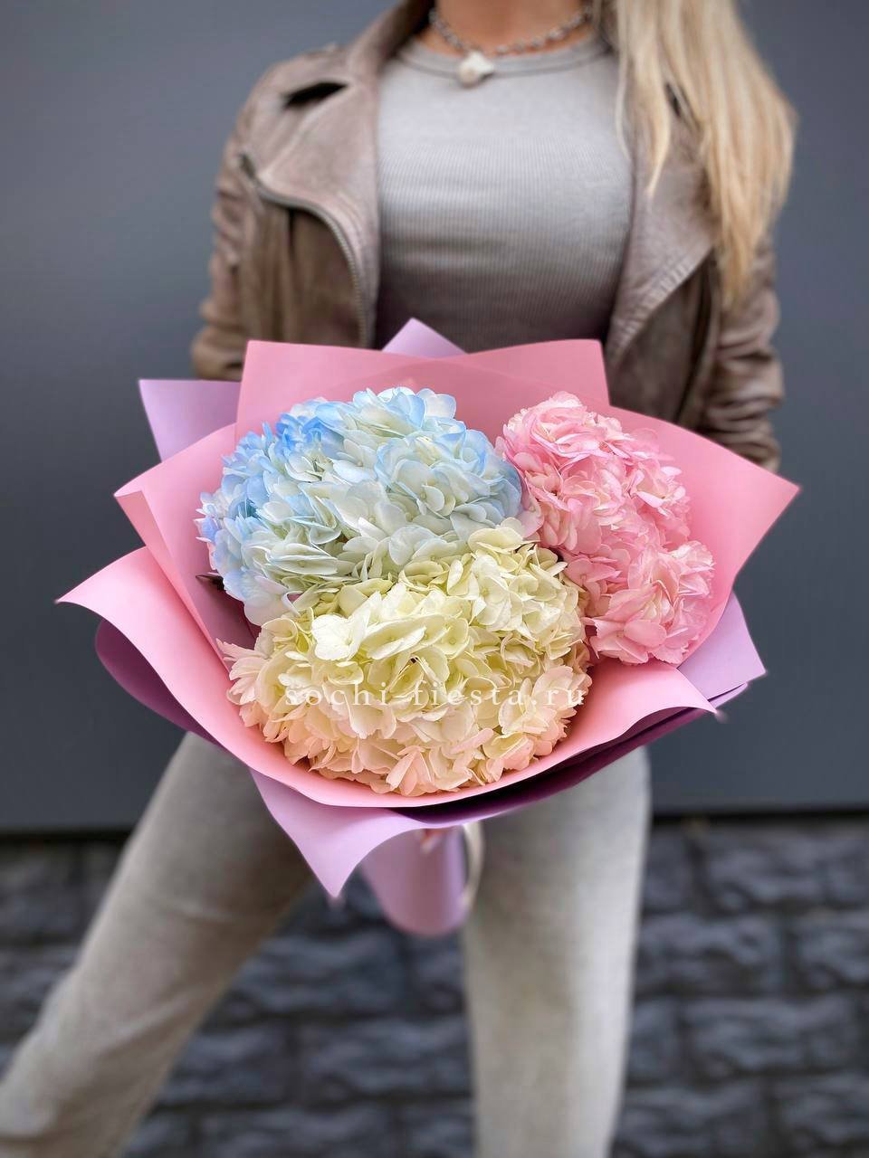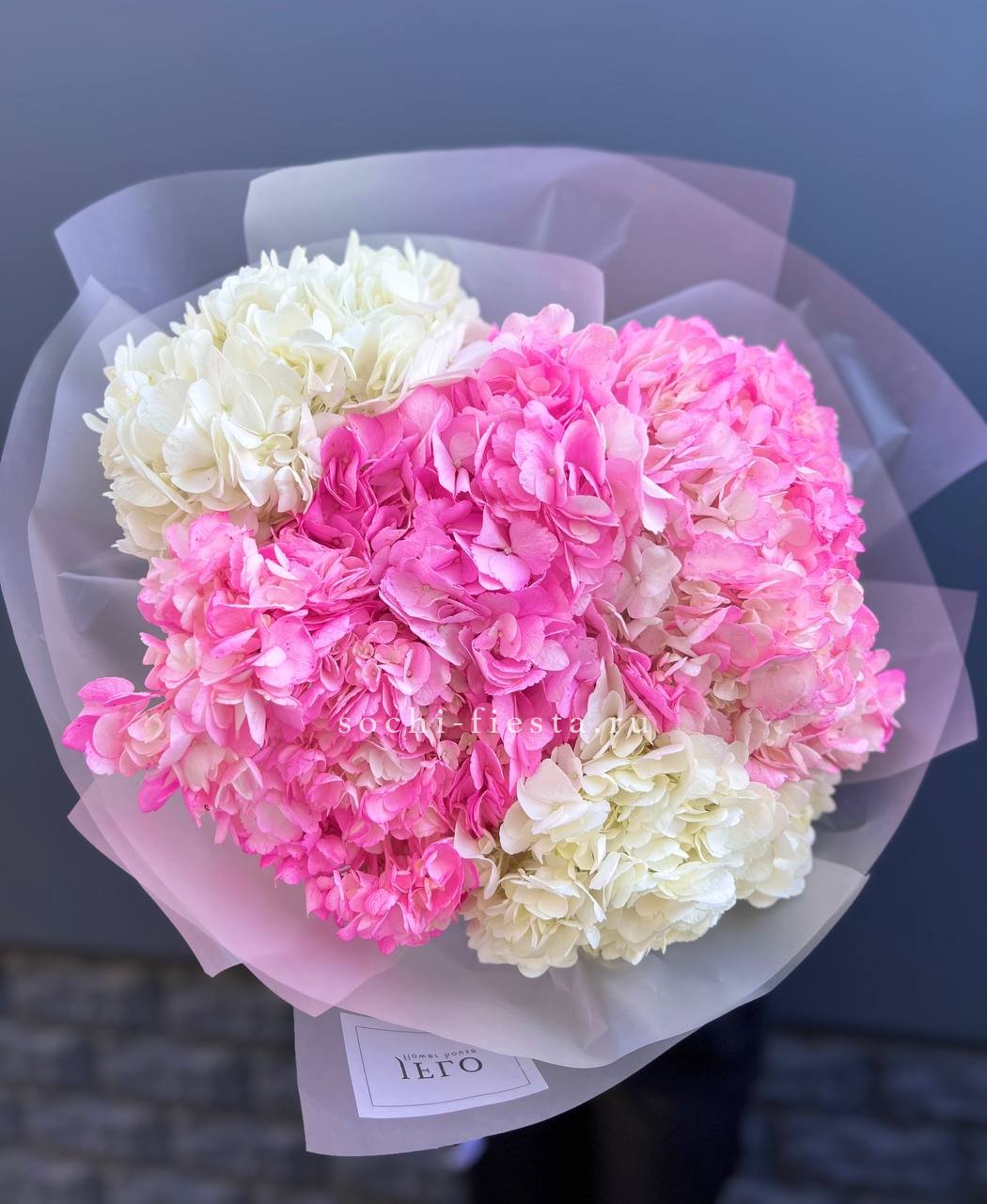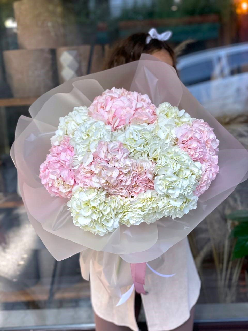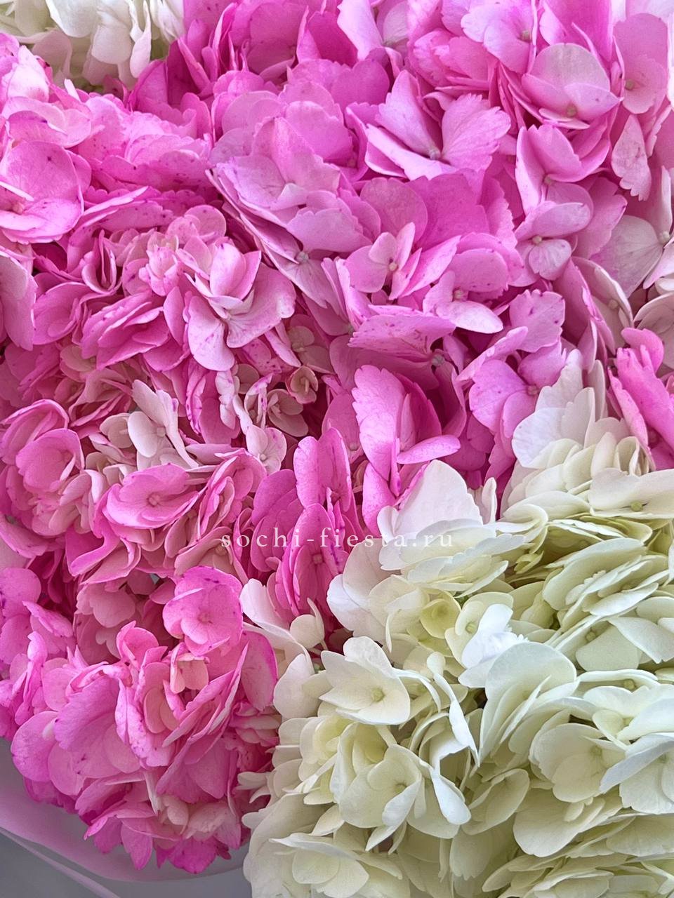 Двадцать пять соцветий гортензий разных оттенков формируют пышное облако с естественной игрой цвета. Каждая головка раскрывается по-своему, создавая живую фактуру без четких границ между тонами.