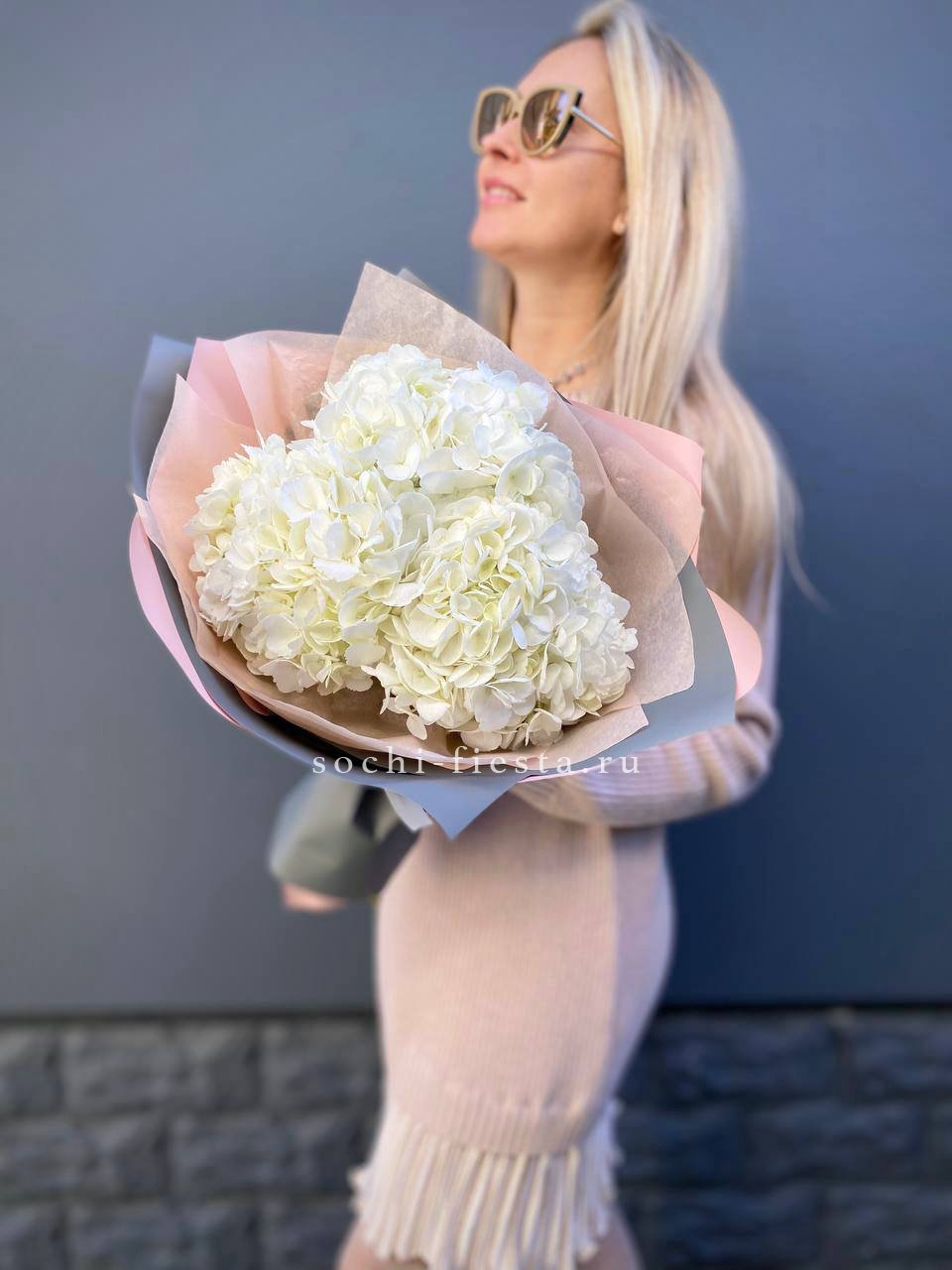 Воздушные шапки соцветий собраны в пышную охапку белоснежного цвета. Гортензия создаёт объёмную текстуру и заполняет пространство мягким природным светом. Букет для тех, кто ценит чистоту линий и естественную красоту.