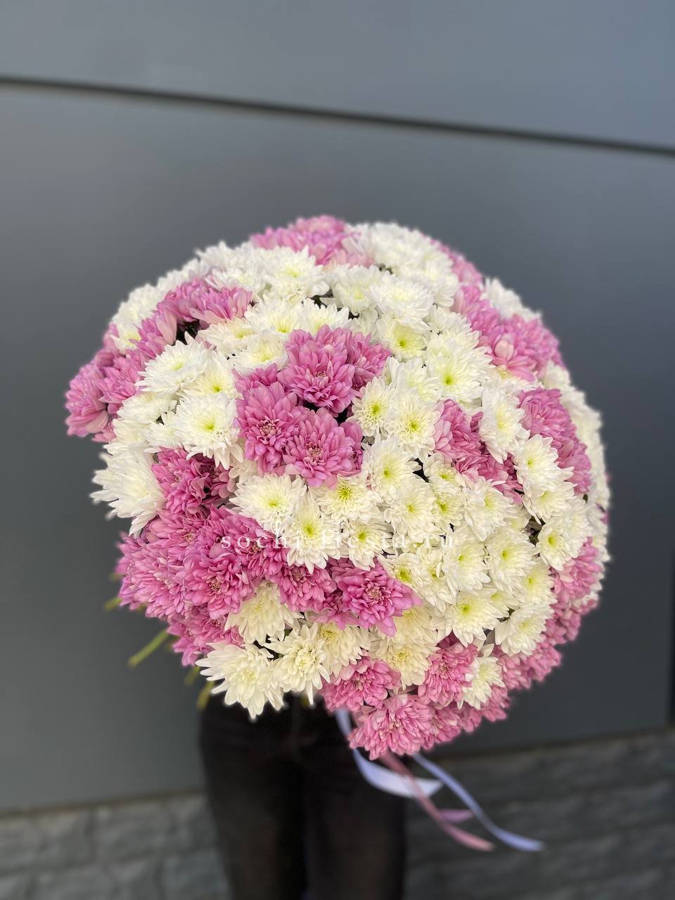 Двадцать пять кустовых хризантем раскрываются густыми шапками разных оттенков. Плотные многослойные бутоны формируют пышный букет с яркой игрой цвета и природной свежестью.