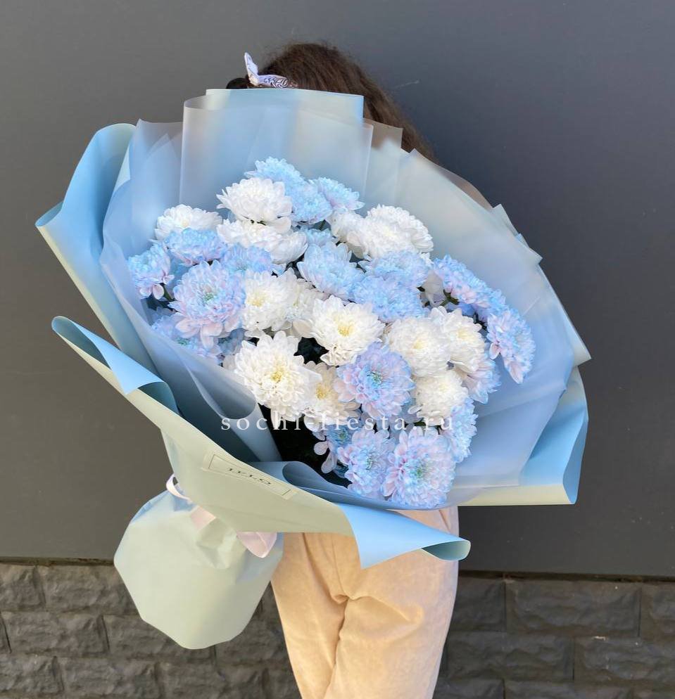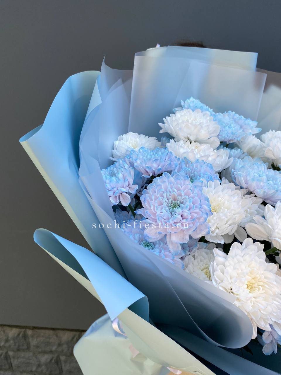 Бело-розовые кустовые хризантемы создают мягкий переход оттенков. Лепестки формируют воздушную структуру, где светлые тона перетекают в насыщенные. Композиция дышит и притягивает взгляд своей лёгкостью.