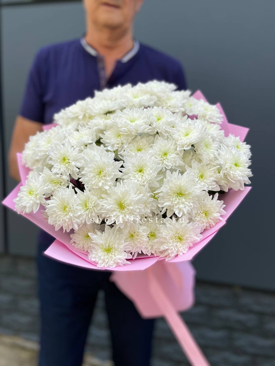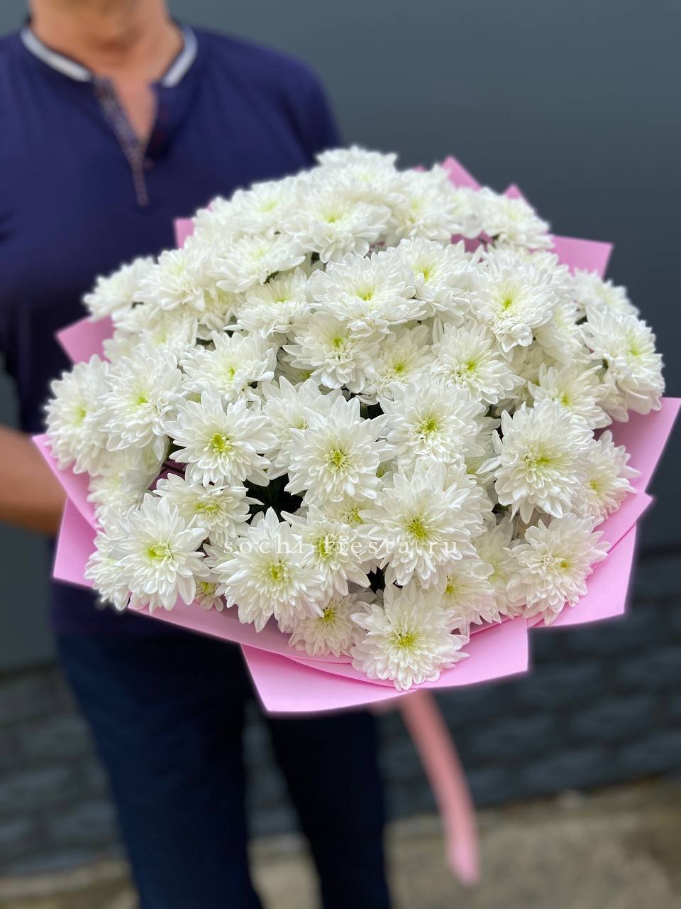 Девять кустовых хризантем собраны в плотный круглый силуэт. Каждая ветка раскрывается веером мелких соцветий, создавая объёмную текстуру. Букет держит форму и выглядит графично.