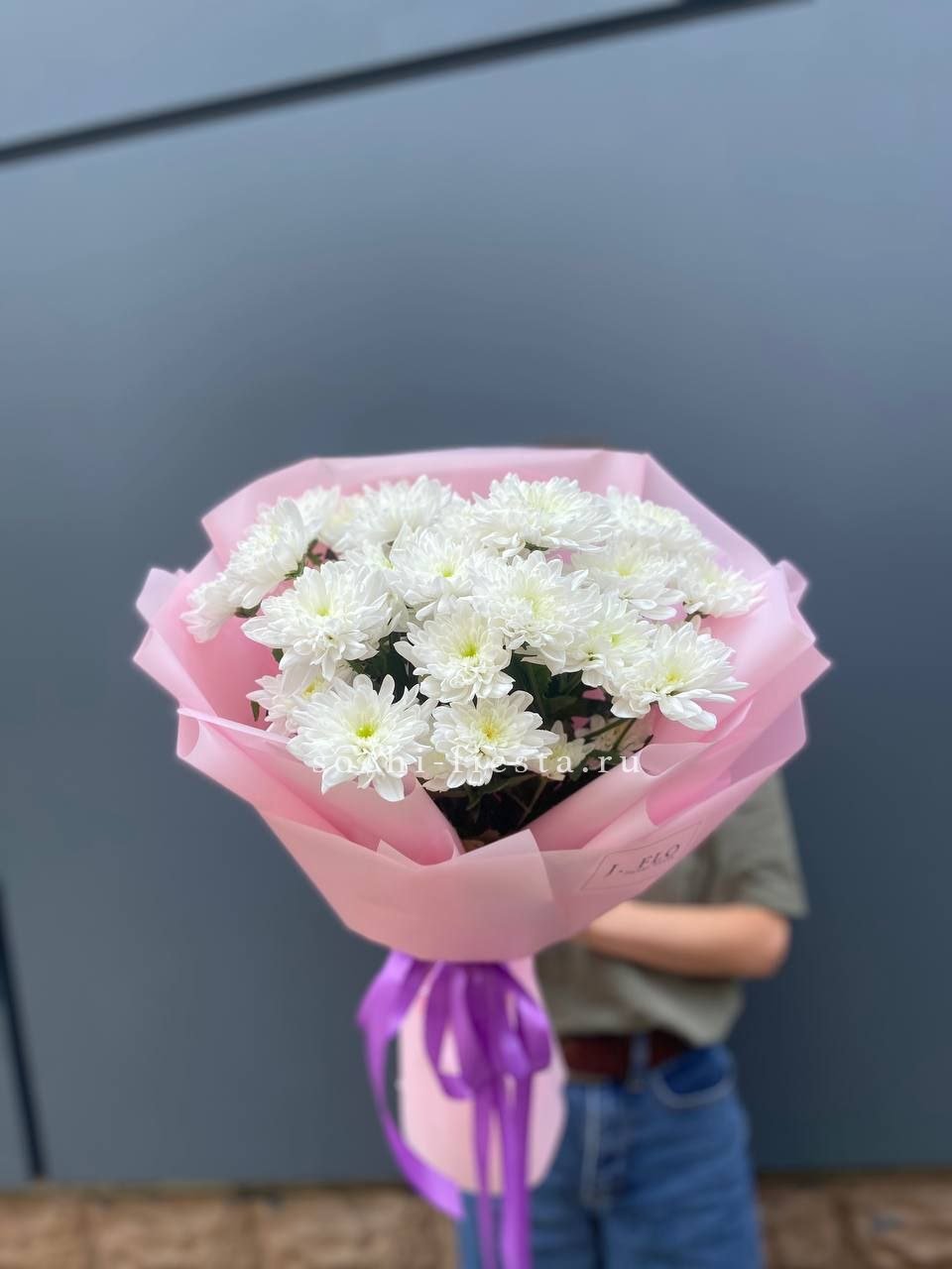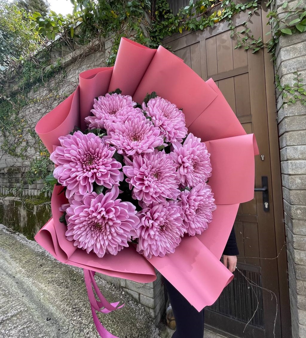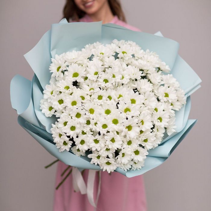Сто одна хризантема формирует воздушное облако с мягким ритмом бутонов. Объемная композиция держит форму и наполняет пространство легким присутствием.