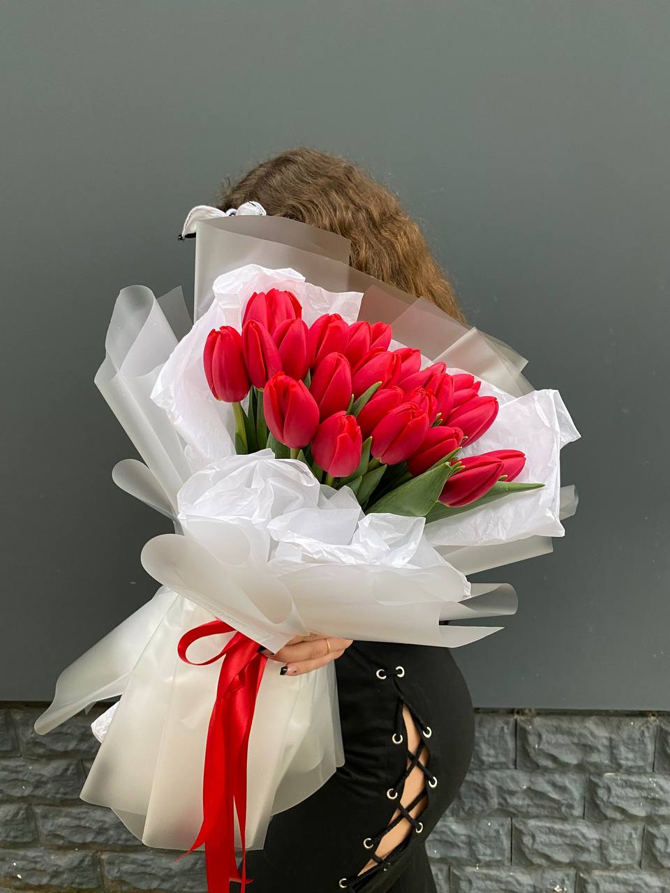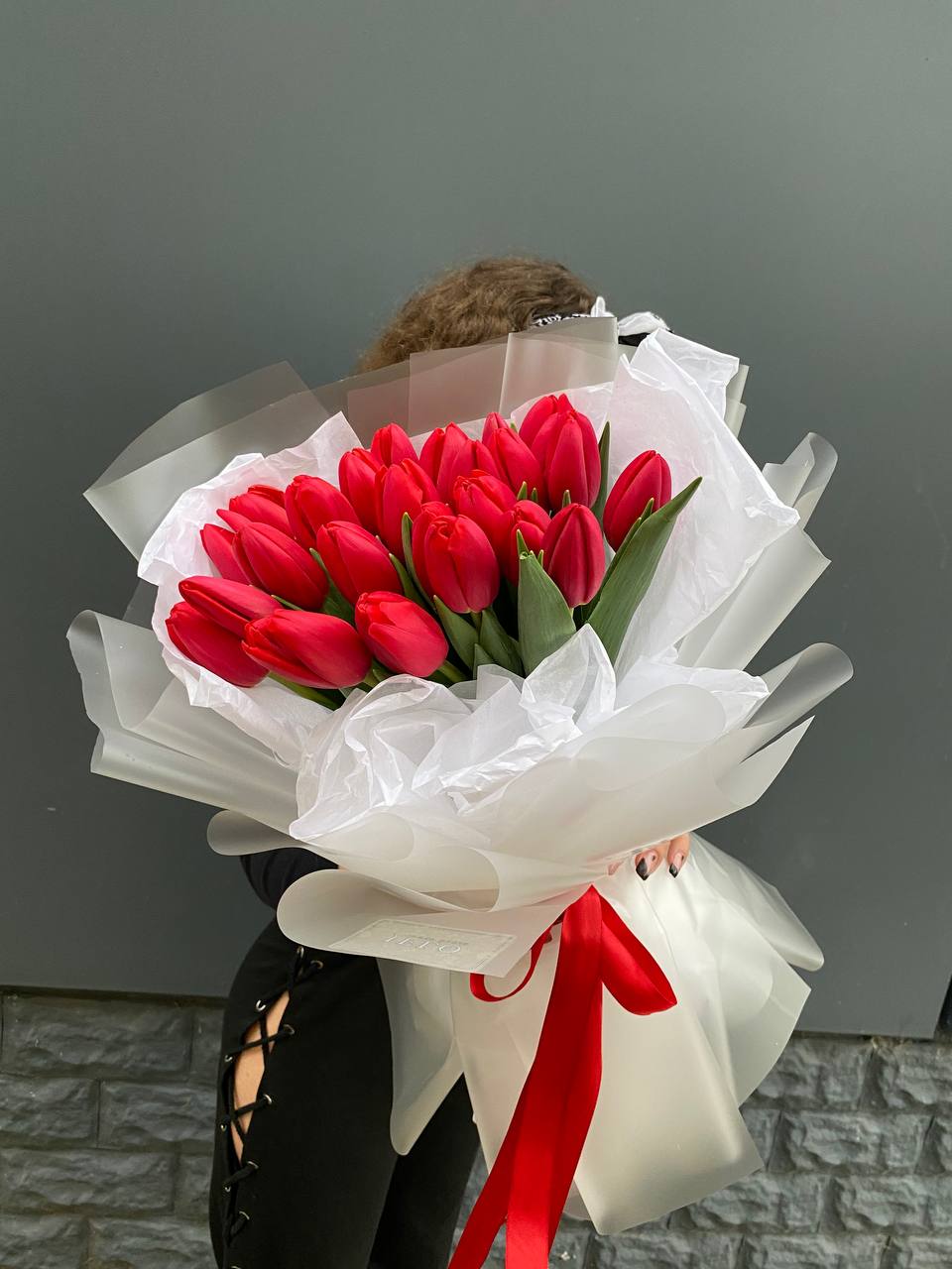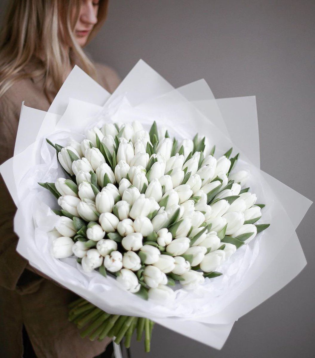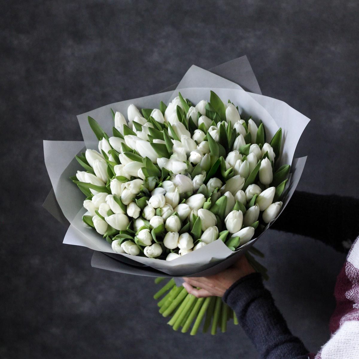 Сто один тюльпан в светлой гамме создаёт впечатляющий объём и выразительное присутствие. Плотная сборка бутонов образует графичную форму с чётким силуэтом.