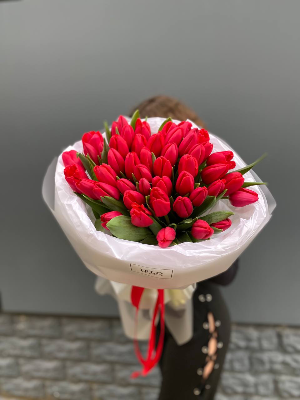 Сто один белоснежный бутон собран в монохромную композицию впечатляющего объема. Плотная сборка создает графичный силуэт, который заполняет пространство светом и весенней свежестью.