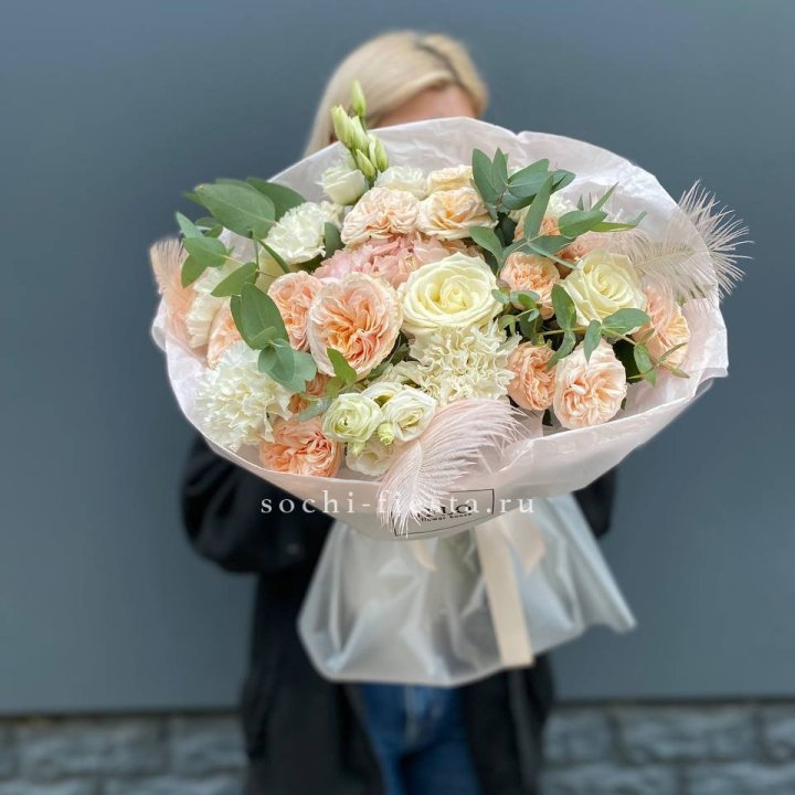 авторский сезонный букет из David Austin роз с нигеллой и эвкалиптом в нежно-розовой нюдовой гамме для подарка в региональном городе