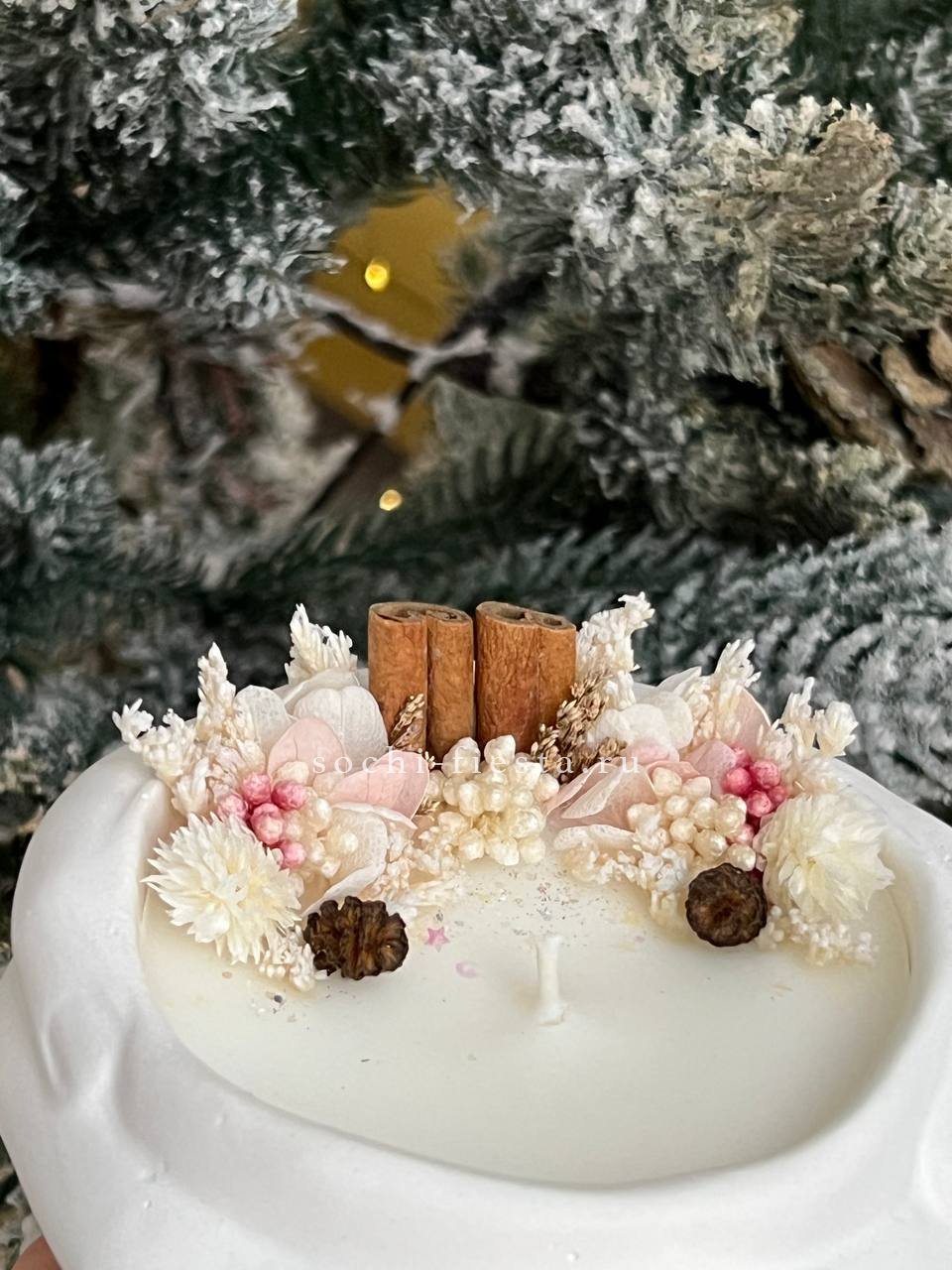 Скульптурная форма из гипса с кокосовым воском и ароматом бузины. Руки бережно держат свечу, создавая камерное пространство для вечернего света и тишины.