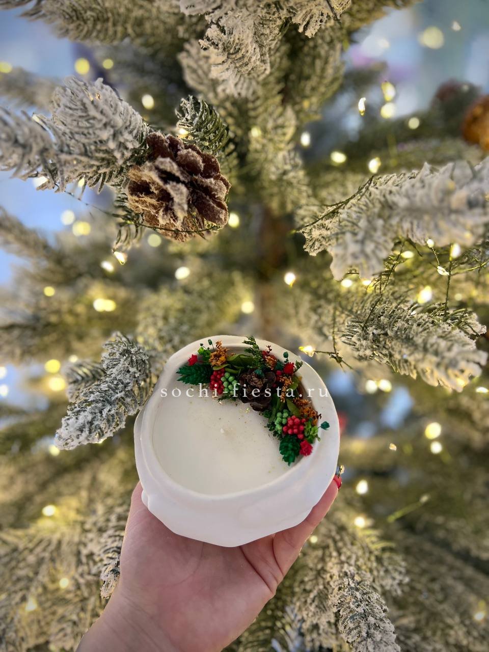 Руки бережно держат шишку — скульптурная форма из гипса с кокосовым воском внутри. Ароматы бузины или мангостина раскрываются мягко и наполняют пространство теплом.