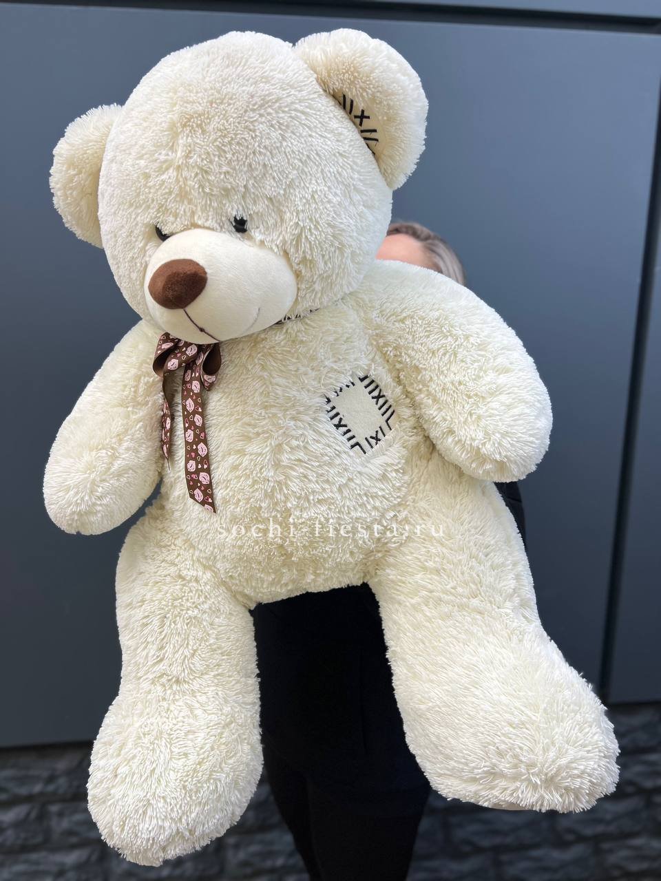 Мягкий плюшевый мишка метровой высоты с густым ворсом и добродушной мордочкой. Объемная фигура с крепкими лапами и округлыми формами создает ощущение уюта и надежности в любом пространстве.