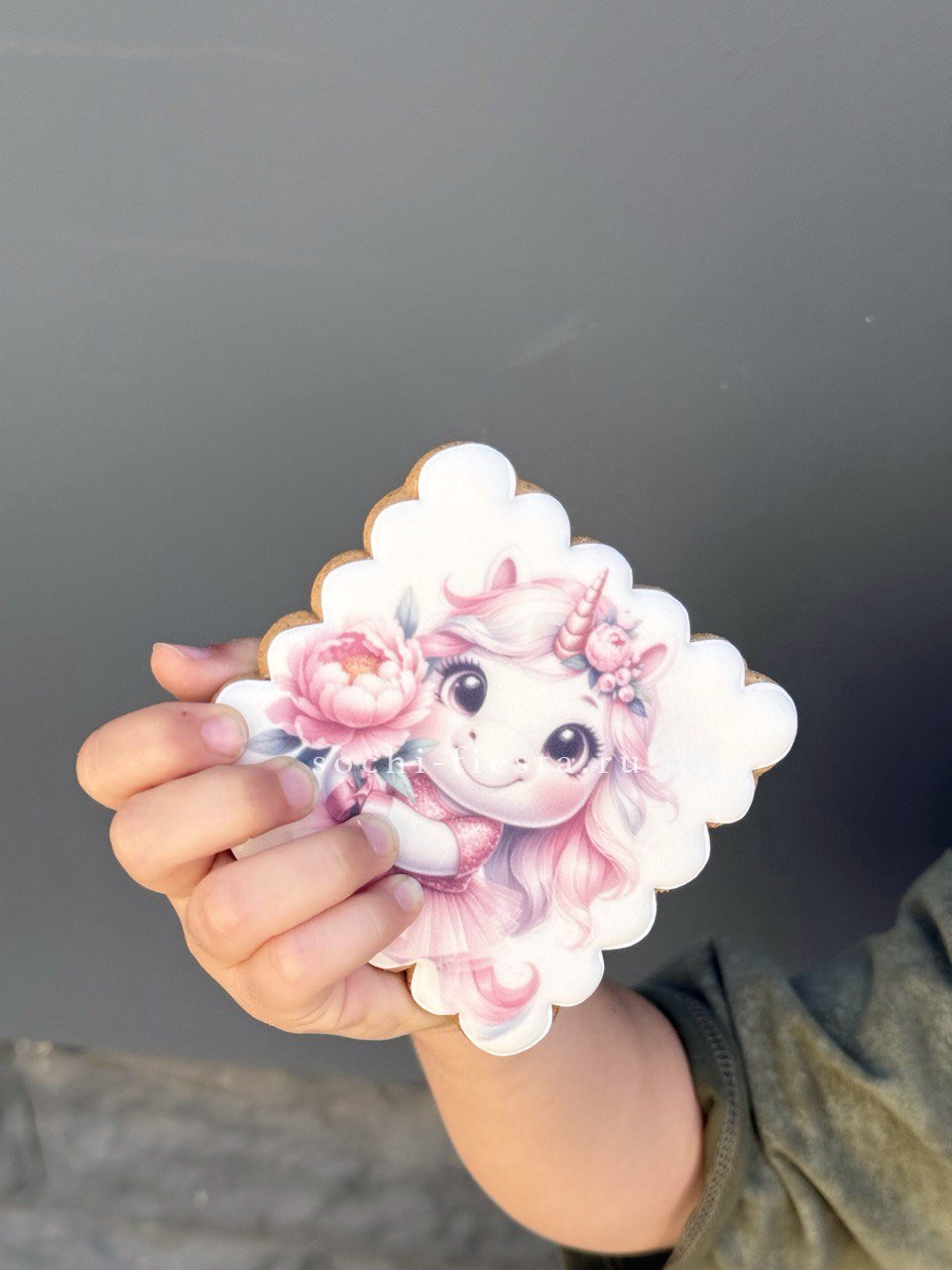 Расписанный вручную пряник с волшебным единорогом дополнит цветочную композицию. Яркие детали и аккуратная глазурь создают самостоятельный подарок внутри подарка.
