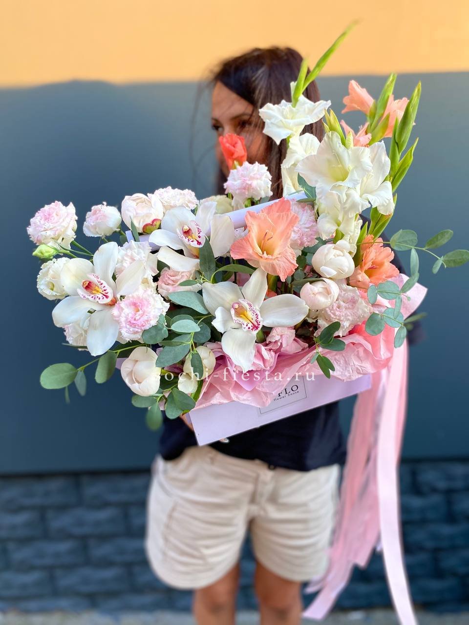 цветочная композиция в нежно-кремовых тонах с применением орхидеи, эустомы, пионов и других цветов, деревянный ящик, лента.