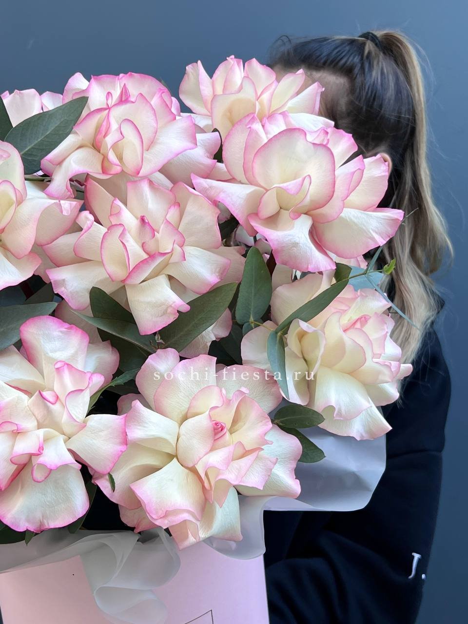 Пятнадцать вывернутых роз в цилиндре держат форму и сохраняют свежесть надолго. Эвкалипт обрамляет композицию серебристой зеленью и добавляет структурности.