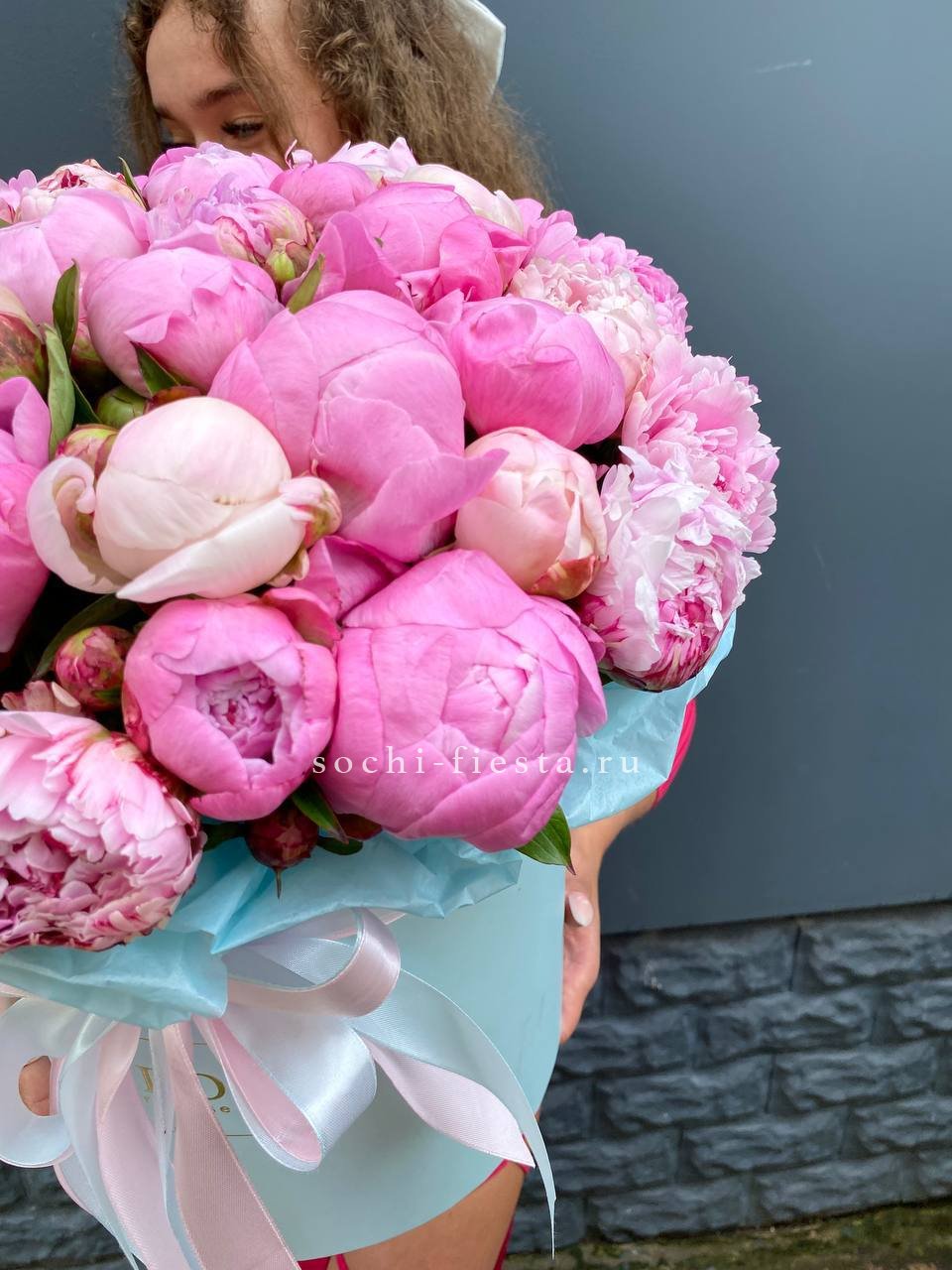 Пятьдесят один пион в одной композиции — это объём, который заполняет собой всё вокруг. Бутоны плотно уложены в цилиндр, создавая эффект цветочного облака. Такой масштаб запоминается с первого взгляда.