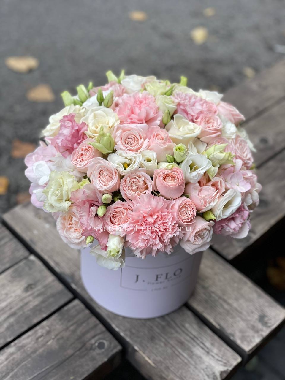 Пионовидные розы раскрываются пышными шапками среди воздушной гортензии и эустомы. Композиция собрана в круглом боксе и держит форму без дополнительной упаковки.