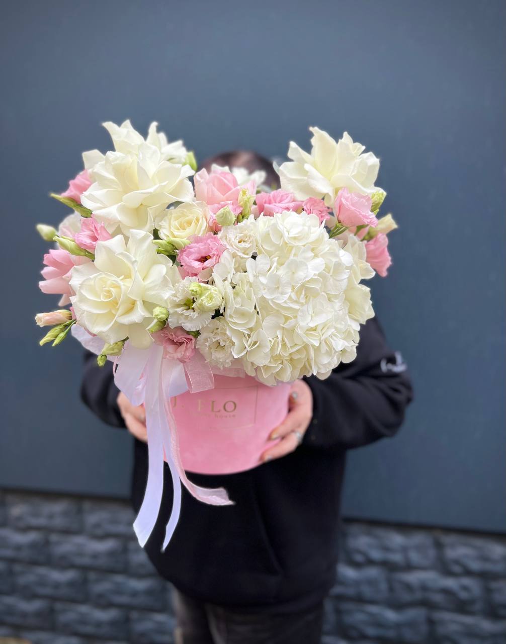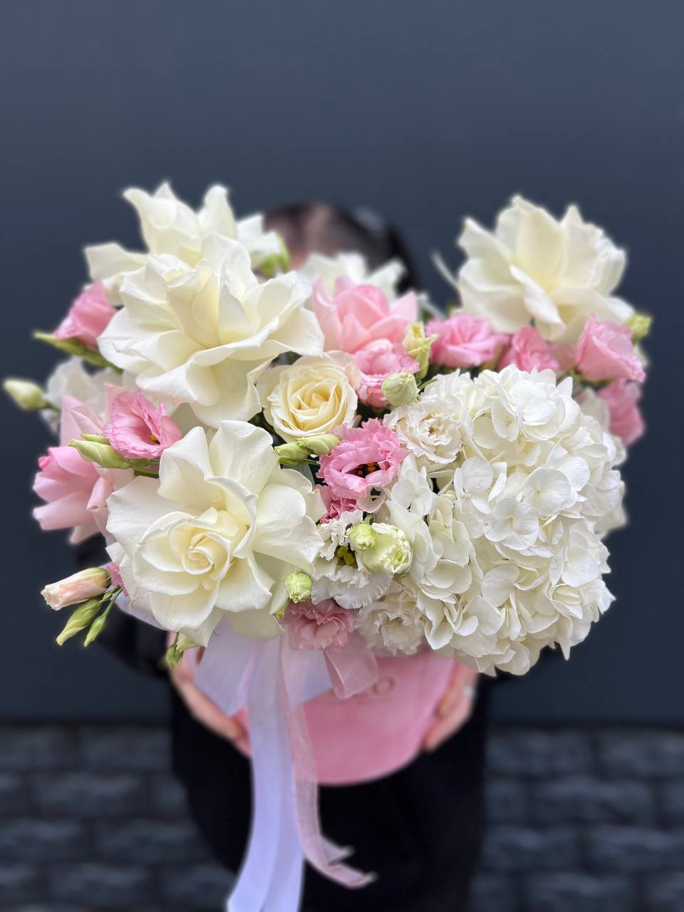 гортензии, пионовидные кустовый розы, декоративная зелень, бокс D25.