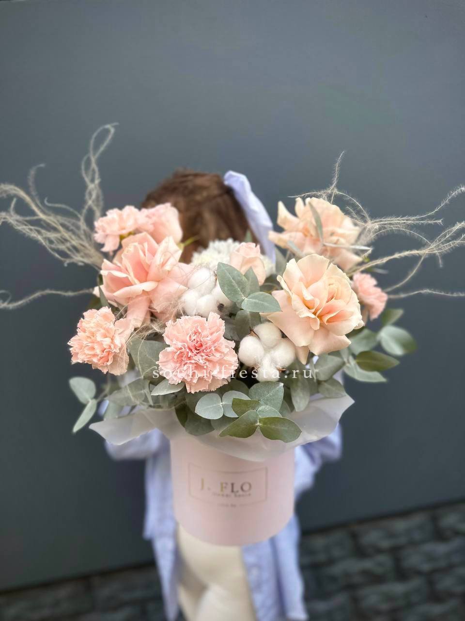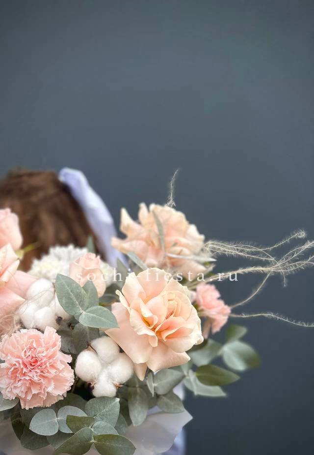 Воздушная композиция в пастельной гамме с акцентом на фактуру раскрытых бутонов. Пионовидные розы и эустома создают объёмный силуэт, а хлопок добавляет графичности.