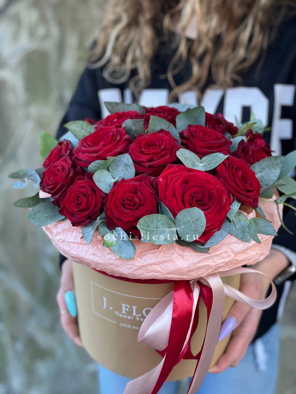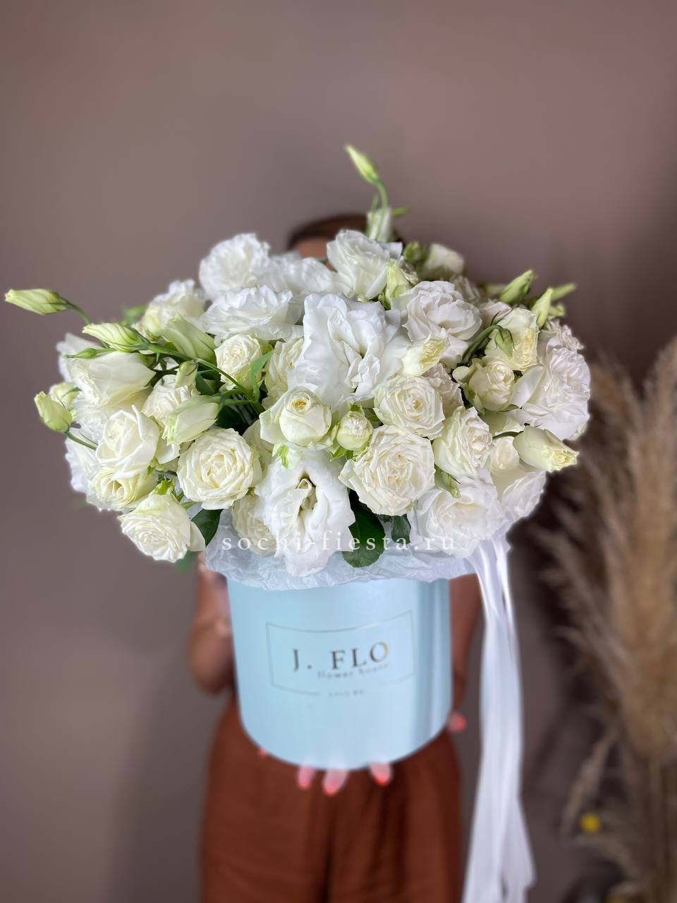 выполнен из эустом, французских роз, эвкалипт, цилиндр D20.