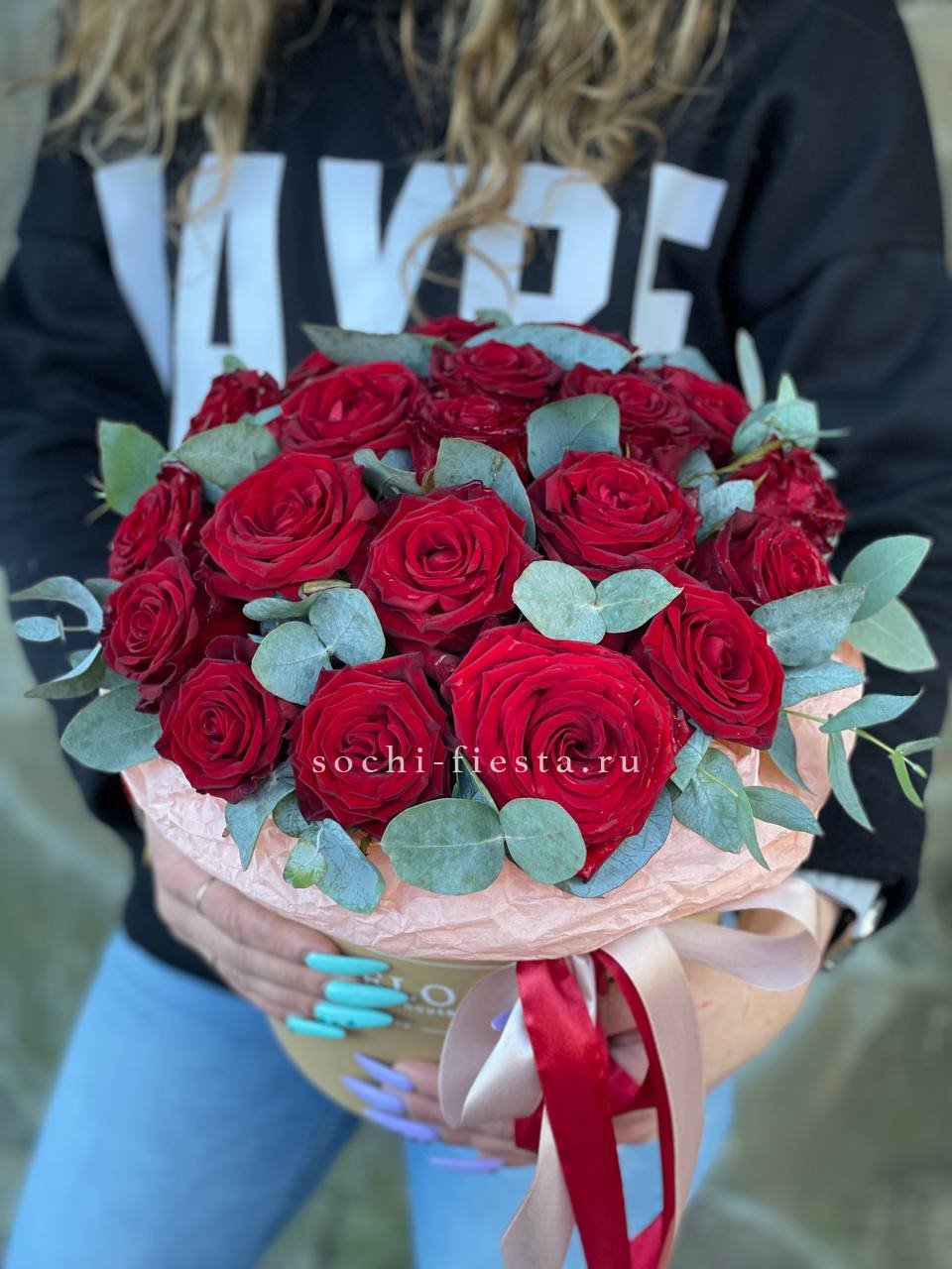 Французские розы и эустомы образуют плотную текстуру с мягкими переходами оттенков. Бархатистые лепестки создают объёмную композицию, которая завершается свежими веточками эвкалипта.
