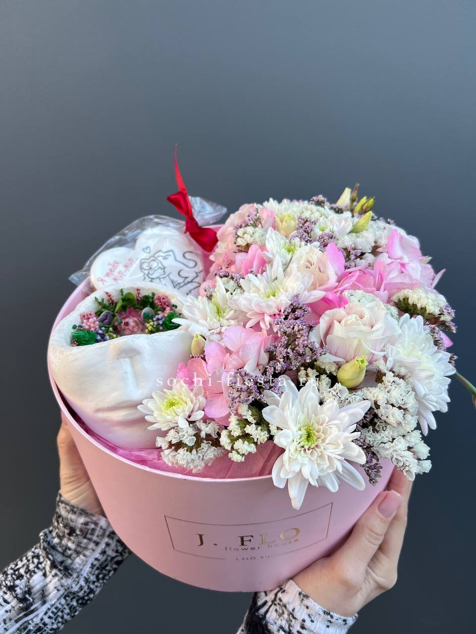 Компактная коробка с декоративной свечой в окружении хризантем и гортензии. Цветы уложены вокруг центрального акцента, создавая уютную сценку для дома.