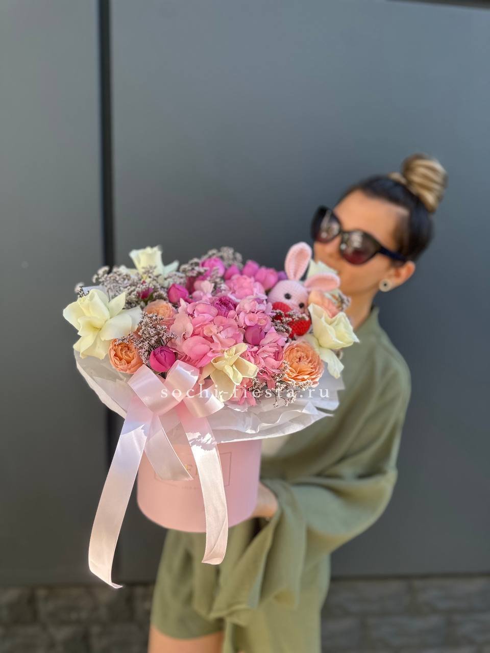 гортензия, одноголовые розы, пионовидные розы, диантусы, лента, цилиндр D20.