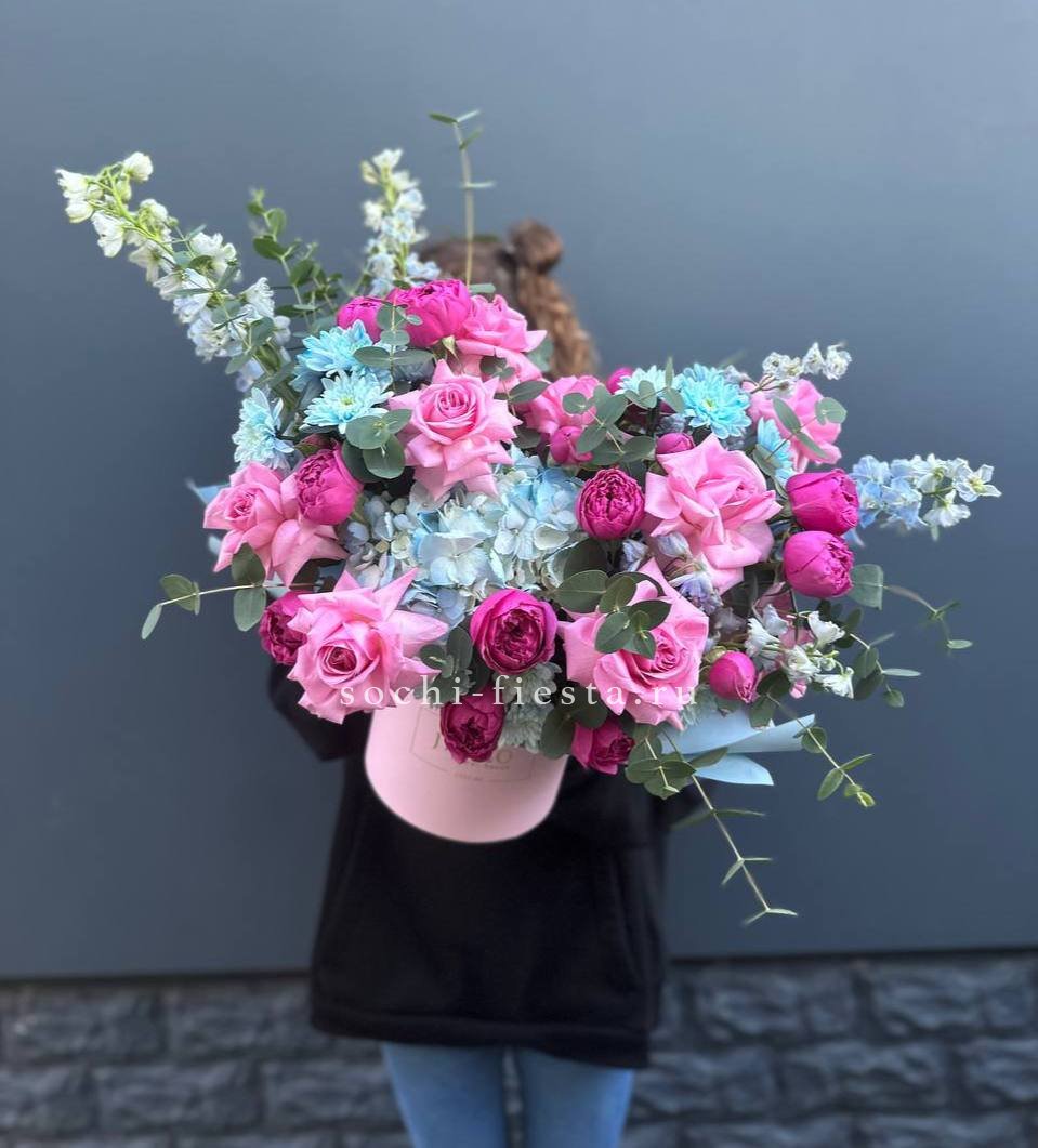 Композиция в боксе собрана на контрасте красных и розовых роз с экзотической протеей. Яркие бомбастики и воздушная гортензия создают объёмную текстуру, а сухоцветы добавляют графичности. Готовое решение для яркого поздравления.