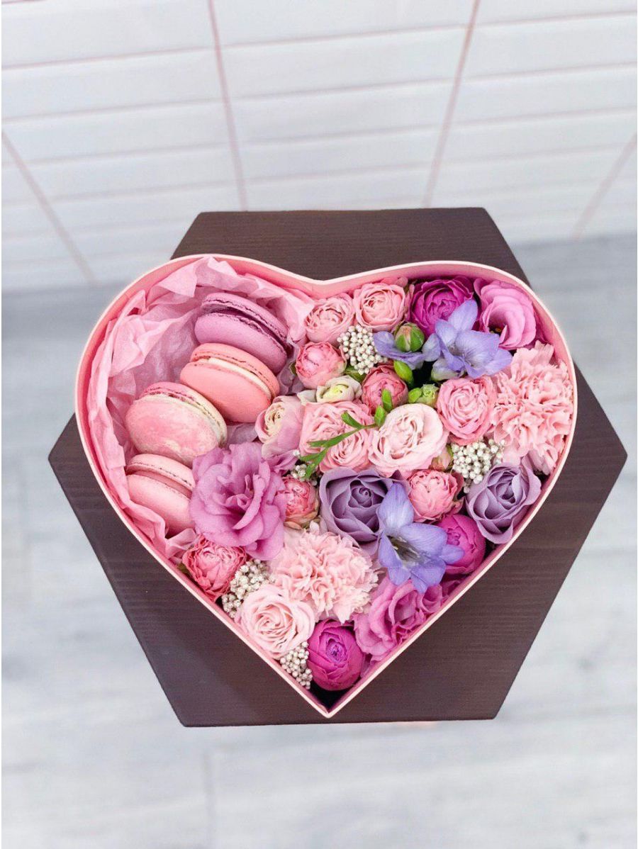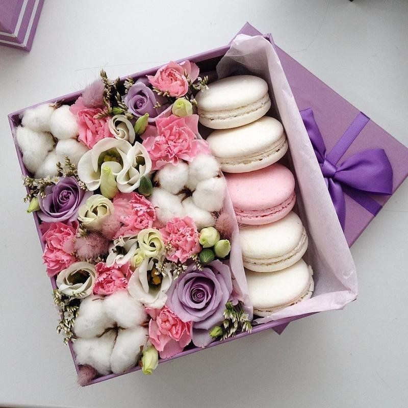 роза кустовая, эустома, диантус,  эвкалипт, 5 макаронс, белый цилиндр D15 Цвет коробки может быть согласован с клиентом.  Наполнение может меняться по наличию.