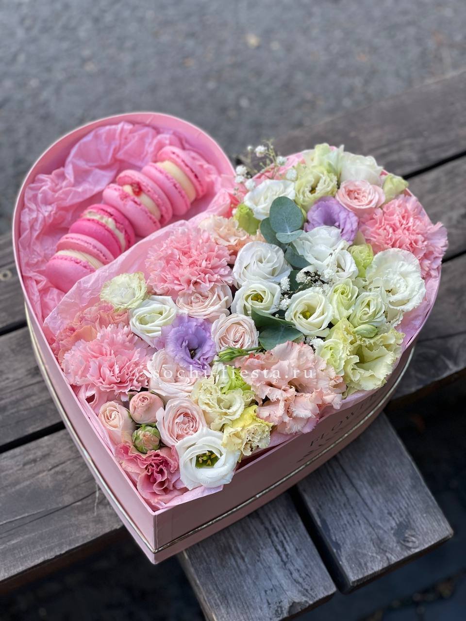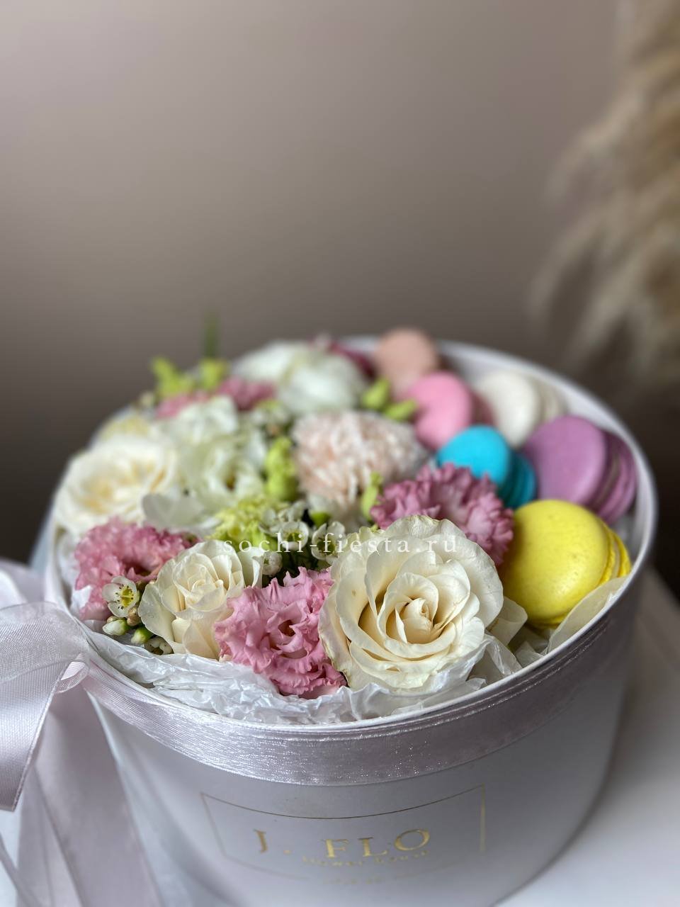 белые розы, альстромерии (по сезону) круглая коробка D20, 6 макаронс.