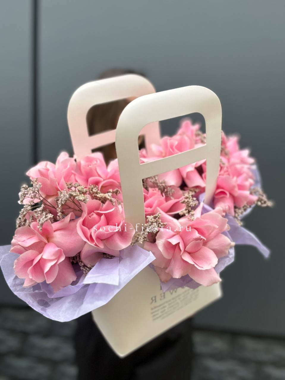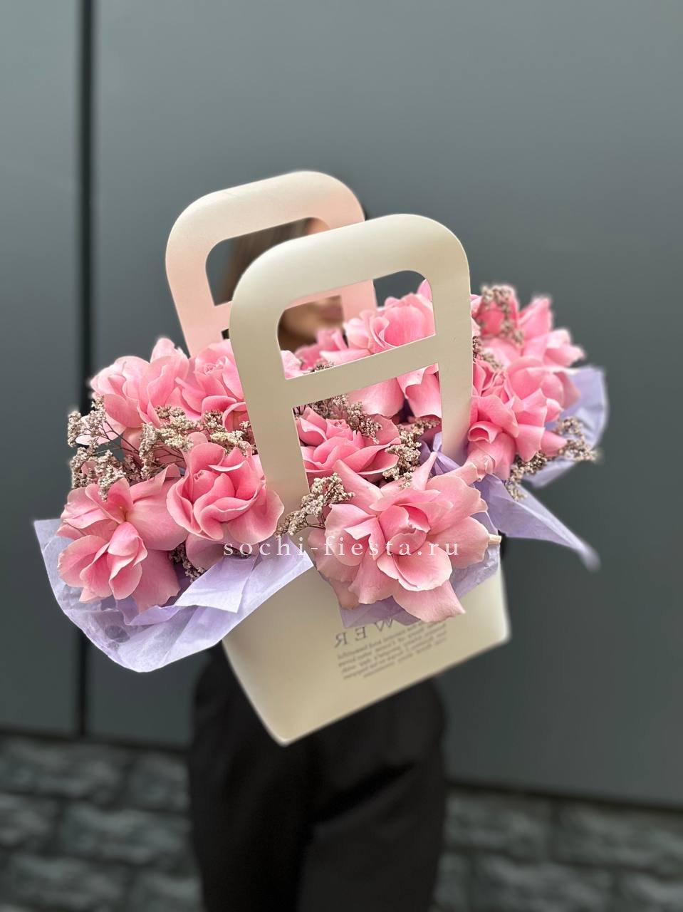 Пышные головки пионовидных роз задают объём, а мелкие соцветия диантуса разбивают плотность. Гортензия добавляет воздушную текстуру, эвкалипт смягчает линии. Композиция в сумке-кашпо выглядит свободно и живо.
