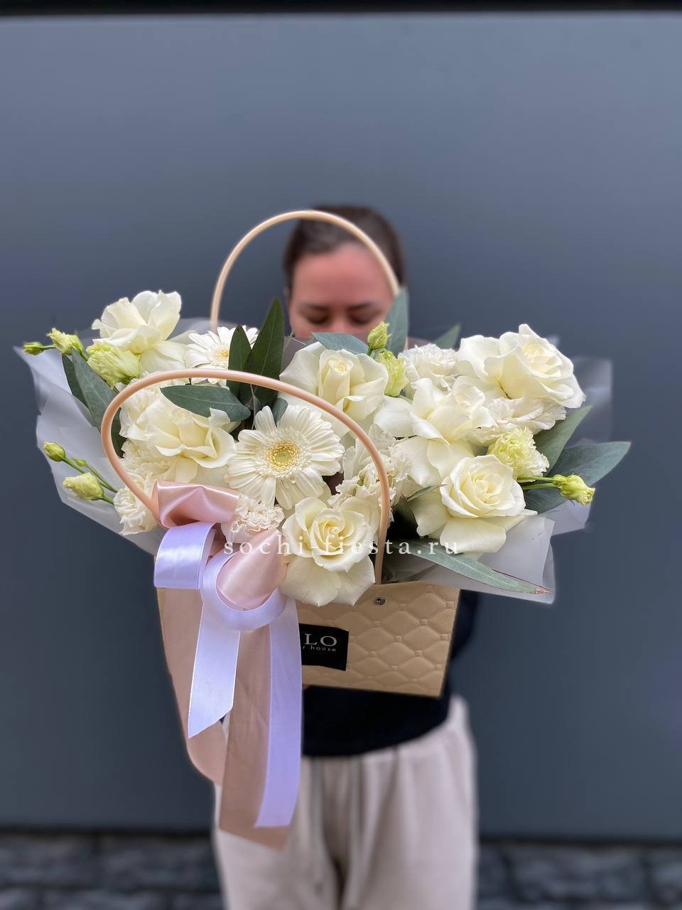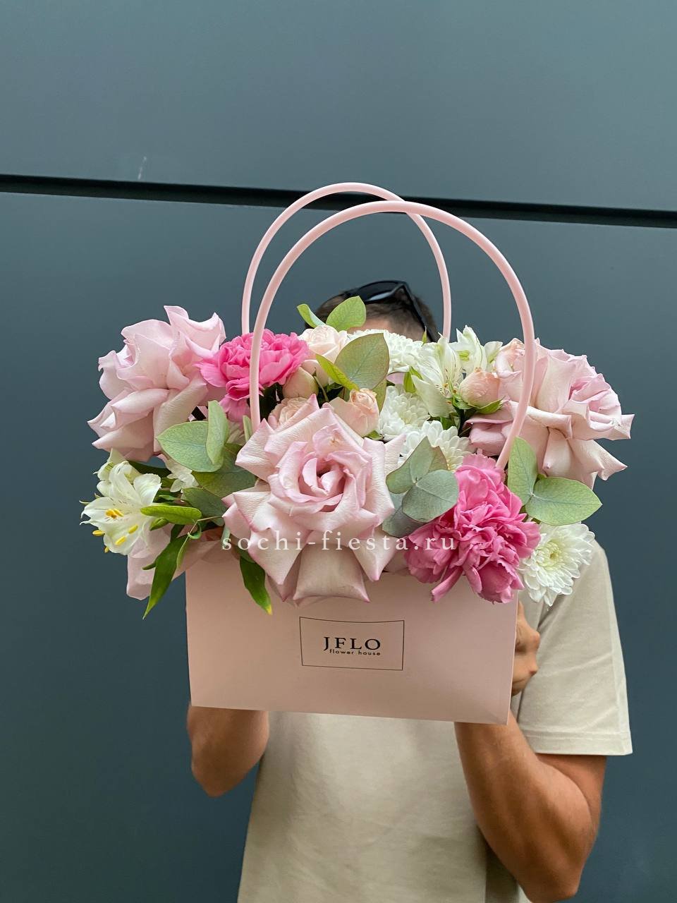 гортензия, герберы, диантусы, роза, альстромерии, эустомы, лента, эвкалипт,  сумка-кашпо.