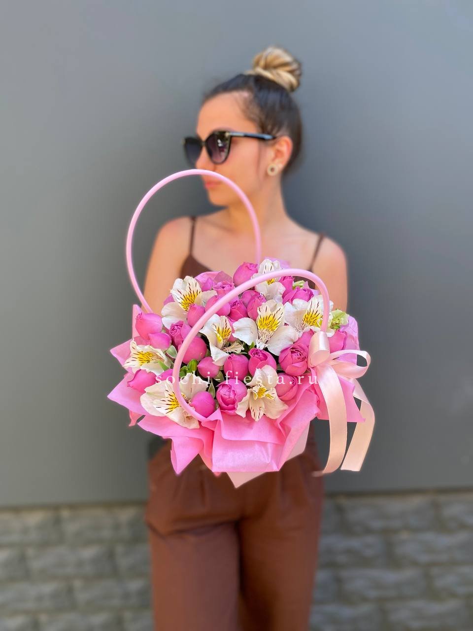 пионовидные кустовые розы, альстромерия, лента, сумка-кашпо.