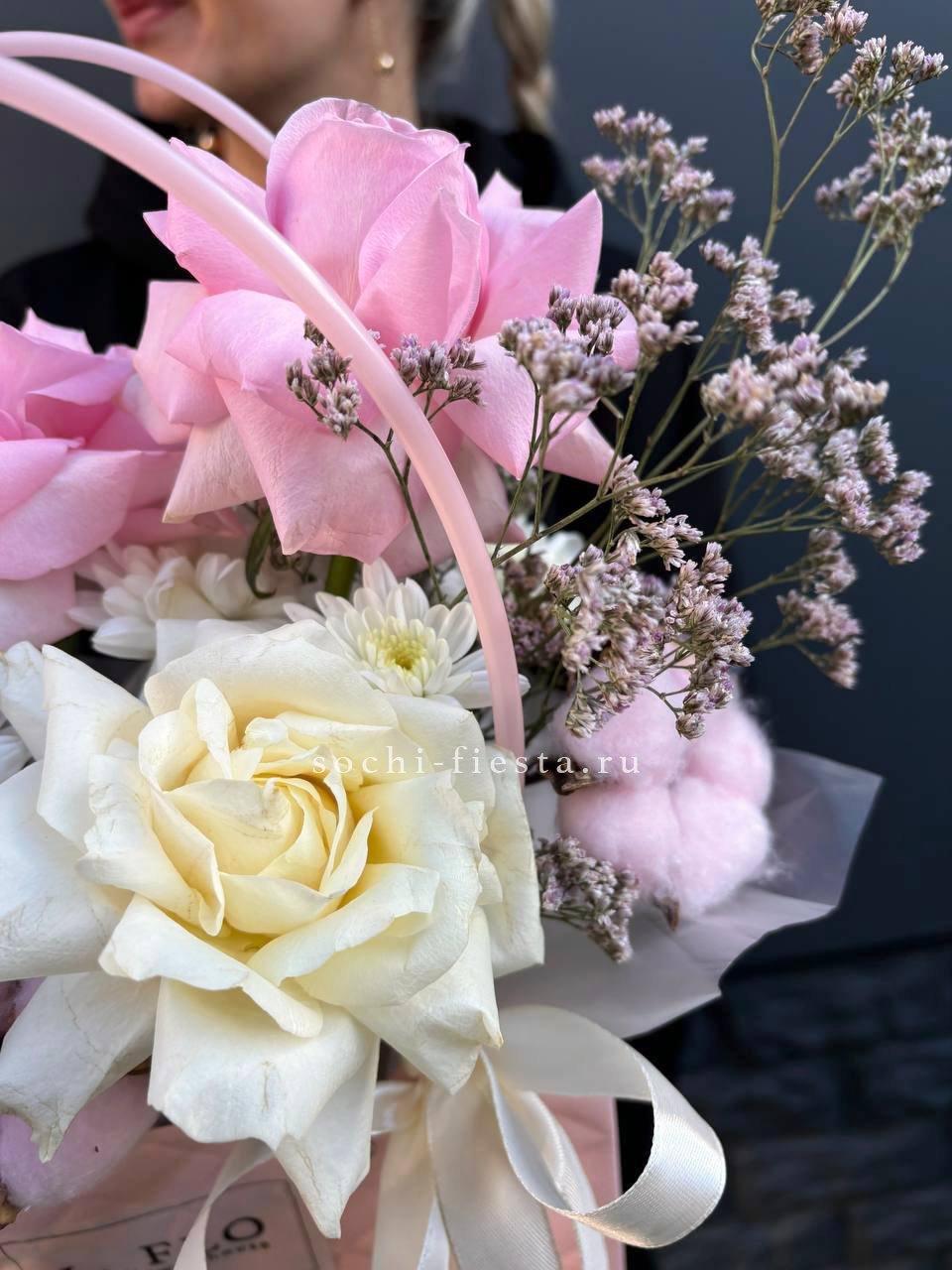 роза белая, роза розовая, хлопок, лимониум, лента, сумка-кашпо.