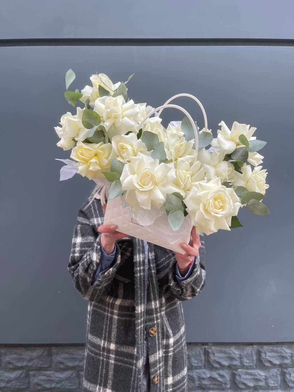 Белые и розовые розы образуют воздушную композицию с мягкими коробочками хлопка и лимониумом. Сумка-кашпо Sofi держит форму и позволяет разместить цветы на столе или полке. Букет выглядит аккуратно и остается свежим долгое время.