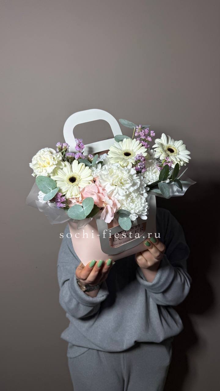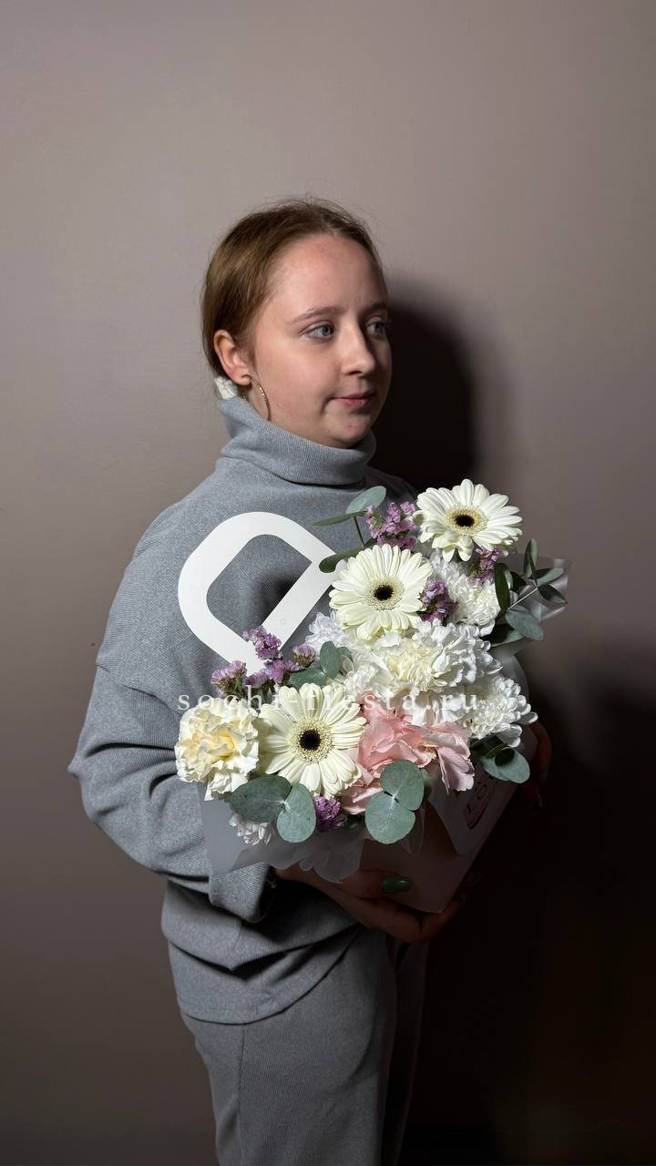Весенняя композиция в миниатюрной сумочке собрана из хризантем, роз и пушистых веток вербы. Хлопок добавляет мягкости, а эвкалипт освежает общую картину. Компактная форма позволяет разместить её на столе или комоде.