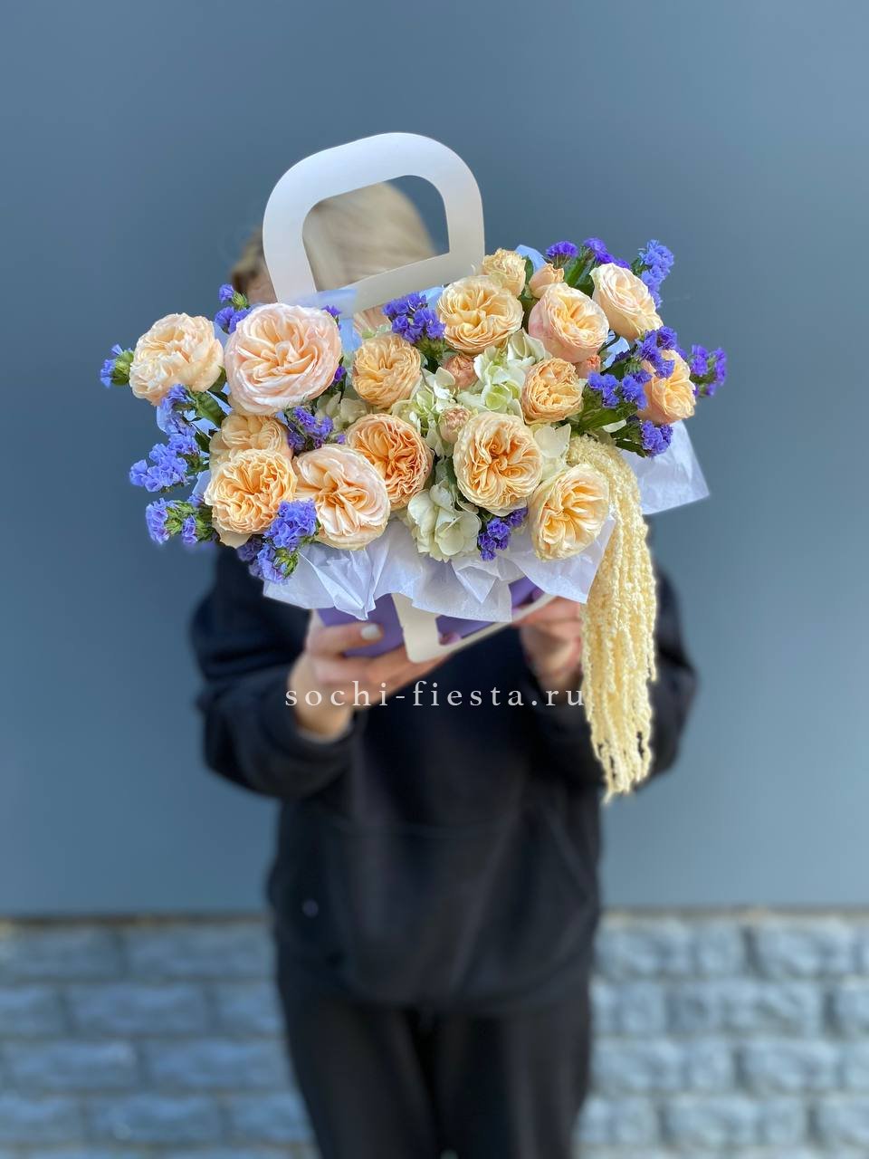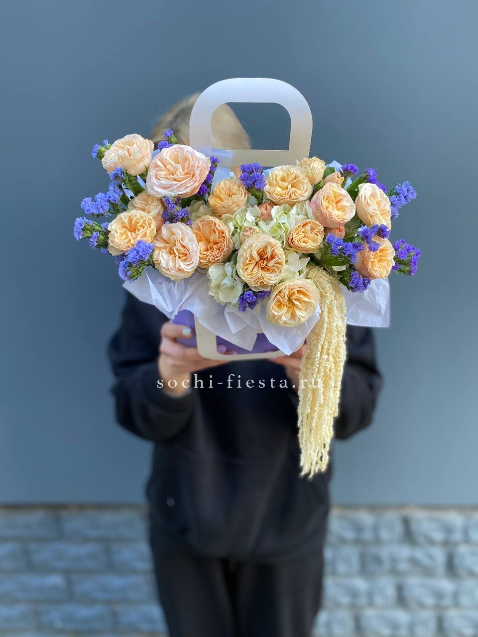 Голубая гортензия и статица задают основной тон, а кустовые розы разбавляют прохладную палитру теплыми нотами. Сумочка держит форму и выглядит собранно.