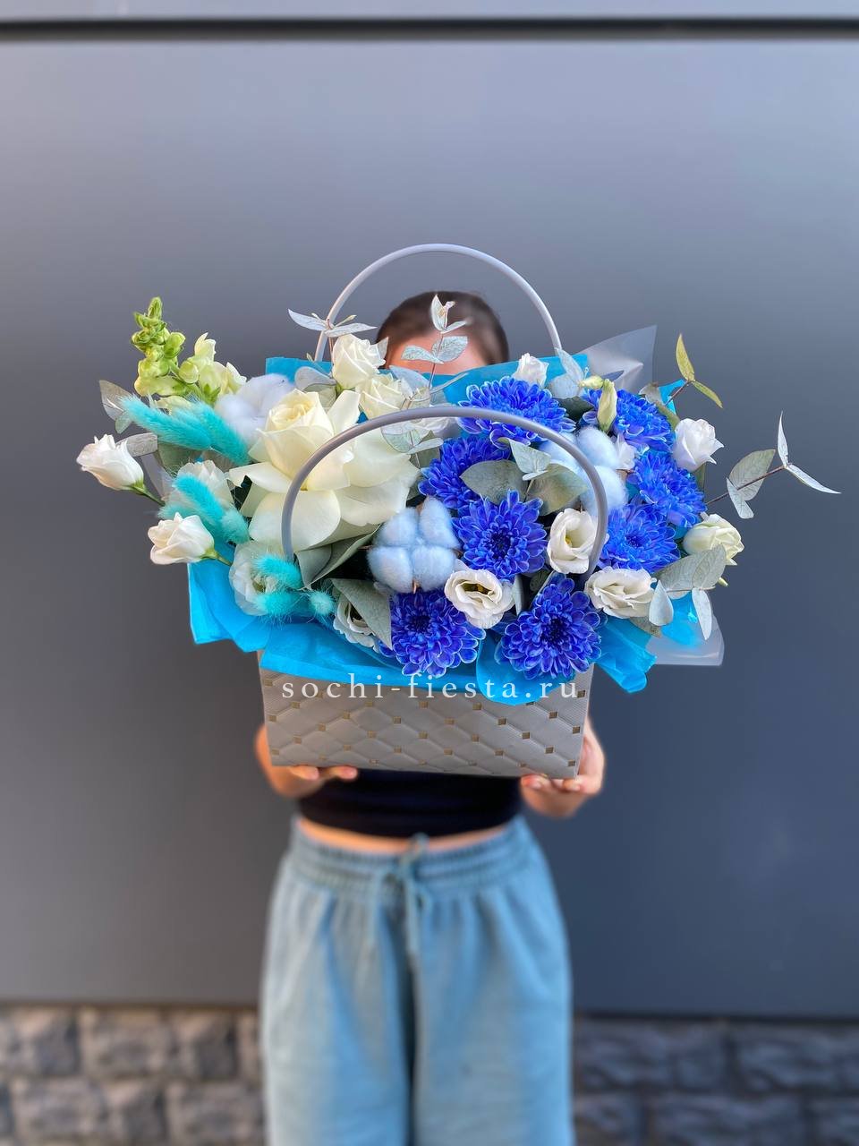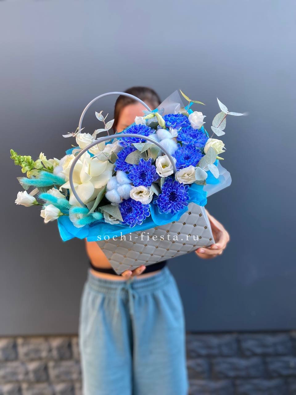 Белые розы и хризантемы сочетаются с воздушной эустомой и хлопком в сумочке. Светлая гамма с прохладным оттенком напоминает морскую свежесть и создает спокойное настроение.