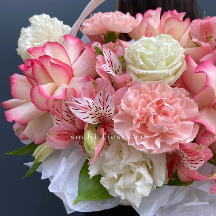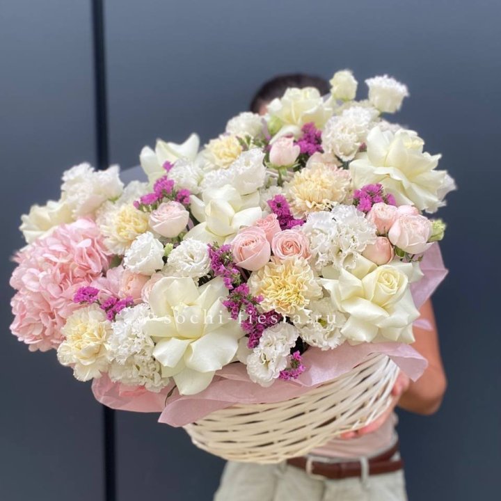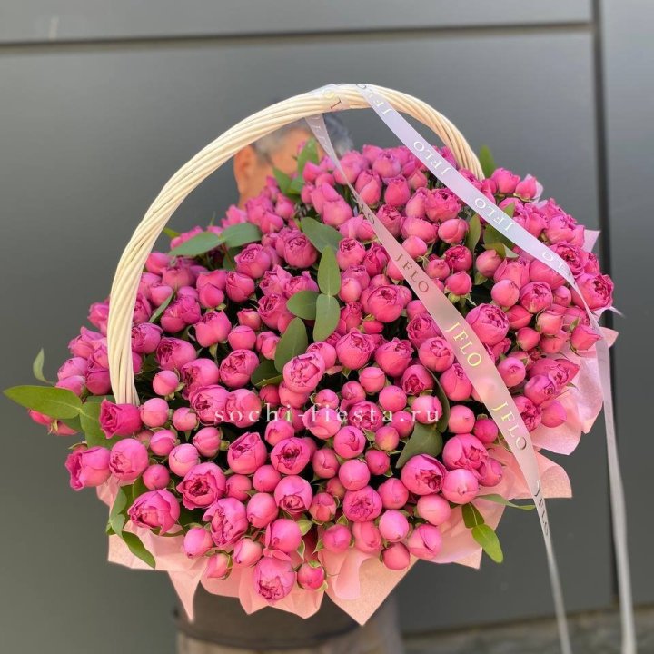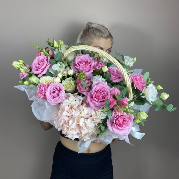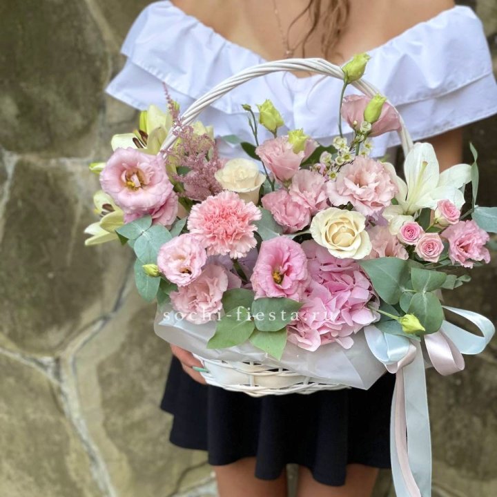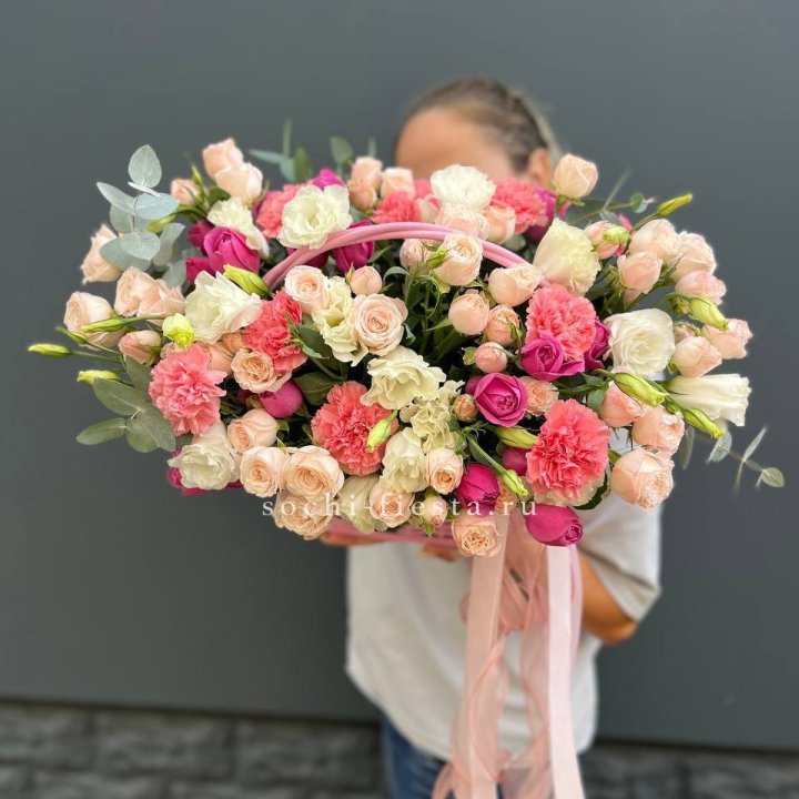 Состав корзин в Йошкар-Оле определяется текущими поставками и сезоном. Розы Freedom, Mondial, Cappuccino — для классических куполообразных аранжировок. Пионы в мае-июне из свежих поставок: Sarah Bernhardt, Red Charm, Bowl of Cream — главный сезонный продукт. Хризантема, альстромерия, гербера — для объёмных торжественных наполнений. Эустома, ранункули — для садовых корзин. Флорист строит состав под конкретный запрос.