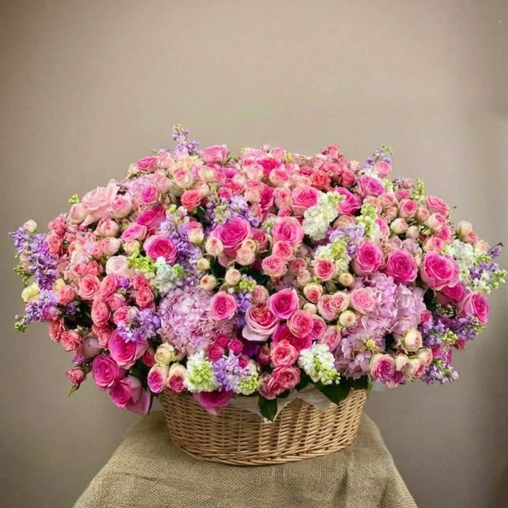 Садовая корзина — главный тренд последних лет. Свободная многовидовая аранжировка в плетёной корзине: эустома, ранункули, нигелла, зелень — ощущение только что срезанных цветов из загородного сада. Покупают те, кто устал от строгих классических форматов и ищет природной органики и лёгкости в подарке.