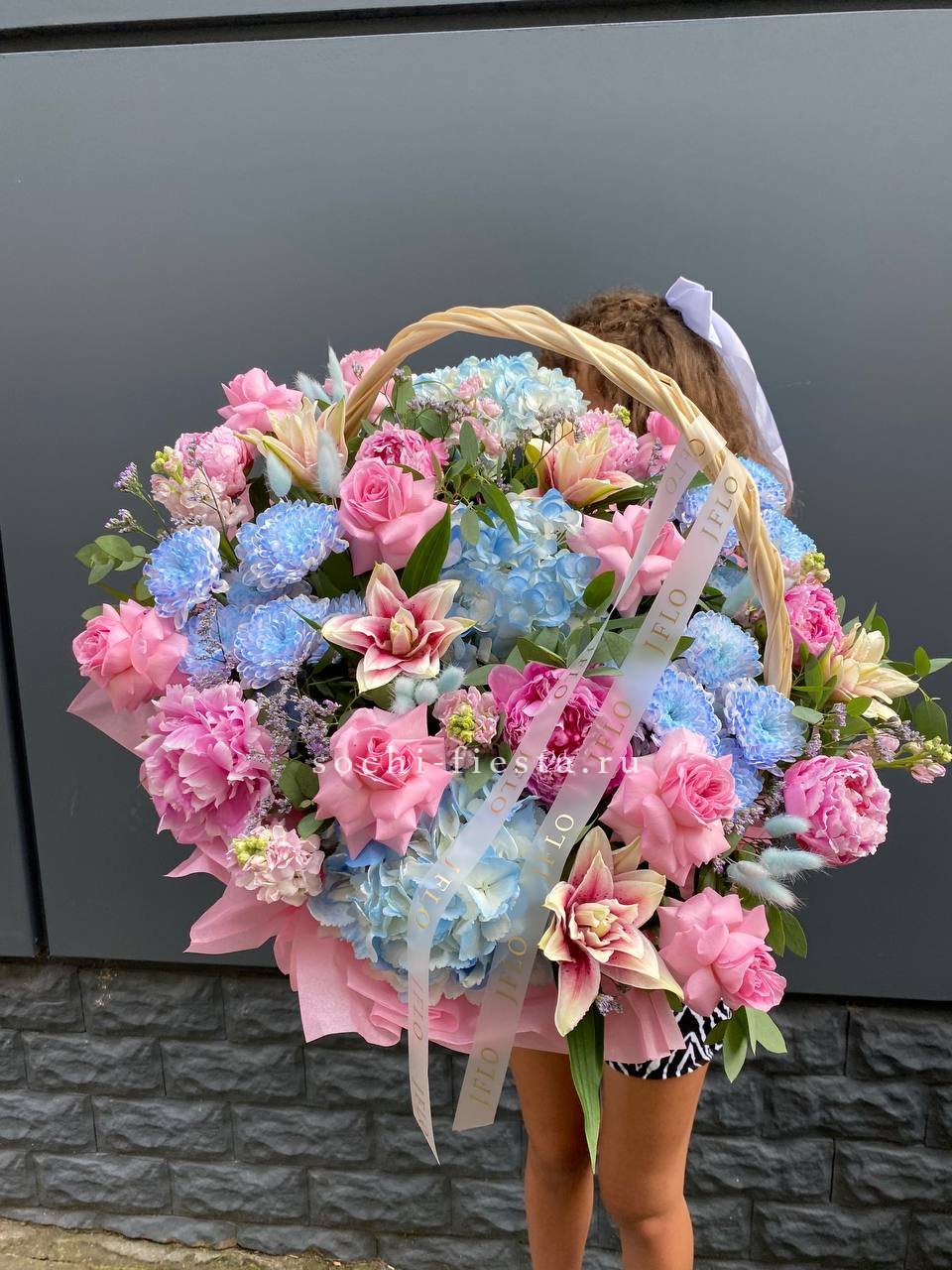 гортензии, лилии, хризантемы, пионы, лимониум, маттиола, корзина.