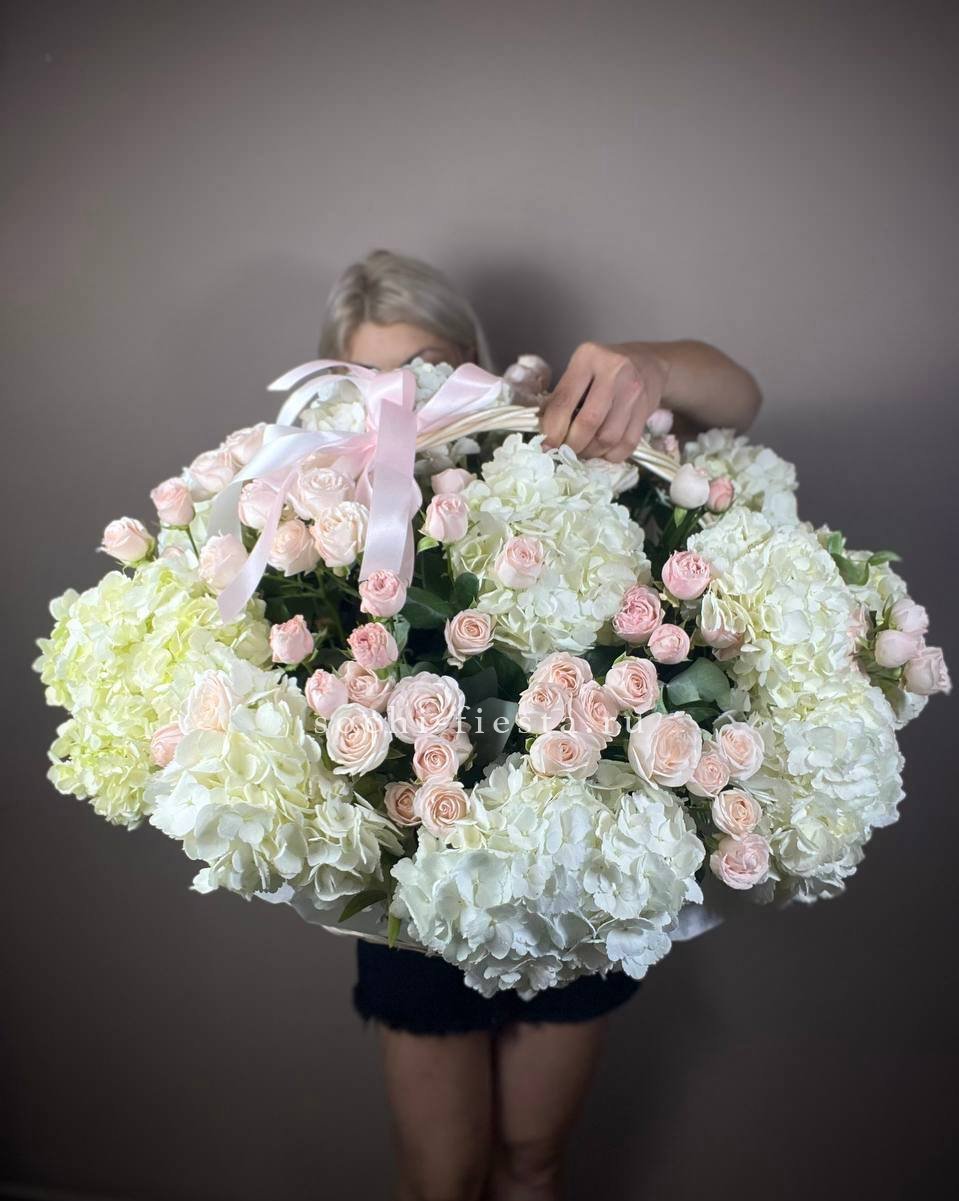 Пышная корзина с бархатными гортензиями и розами разных форм создает живописную композицию в романтичной гамме. Альстромерии и диантусы добавляют воздушности между крупными соцветиями.