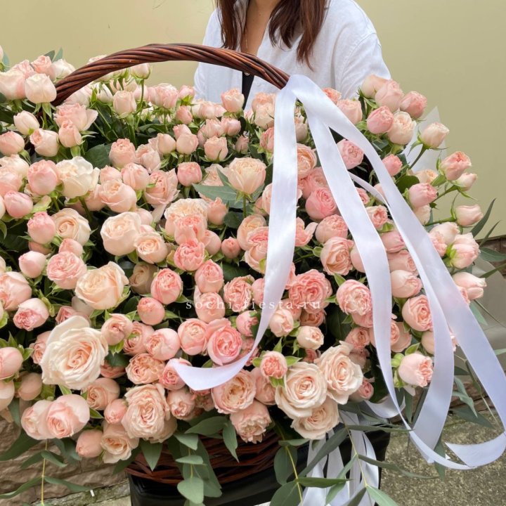 Состав корзин в Йошкар-Оле определяется текущими поставками и сезоном. Розы Freedom, Mondial, Cappuccino — для классических куполообразных аранжировок. Пионы в мае-июне из свежих поставок: Sarah Bernhardt, Red Charm, Bowl of Cream — главный сезонный продукт. Хризантема, альстромерия, гербера — для объёмных торжественных наполнений. Эустома, ранункули — для садовых корзин. Флорист строит состав под конкретный запрос.