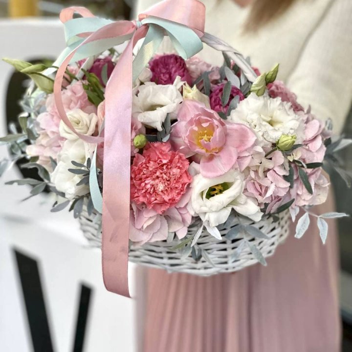 корпоративная цветочная корзина в нейтральной деловой гамме с фирменной лентой для поздравления партнёров садовая цветочная корзина с ранункулями эустомой и эвкалиптом в свободной аранжировке от флориста