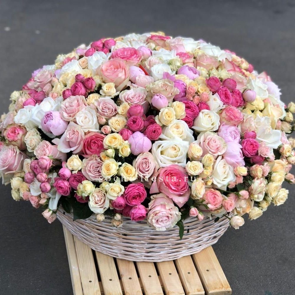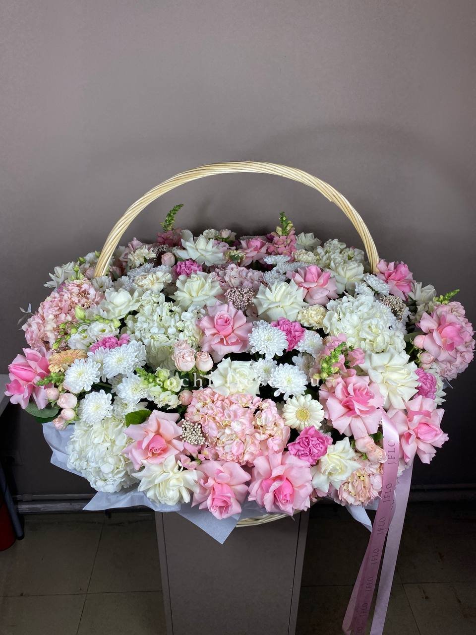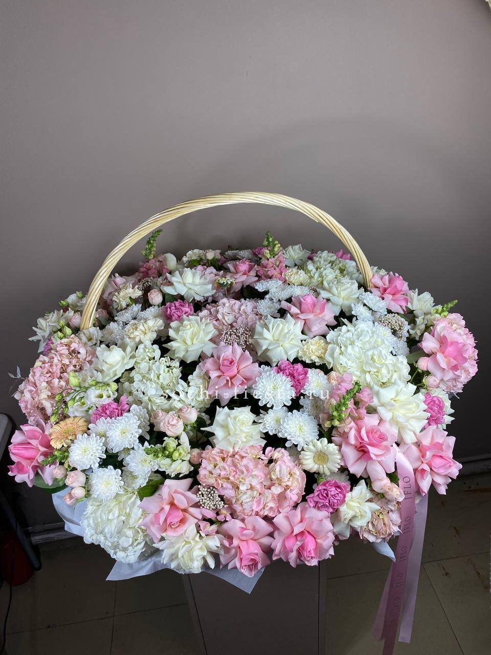 Корзина объединяет гортензии, эустомы, розы и маттиолу в многослойную композицию. Разные фактуры лепестков создают визуальную глубину и насыщенность.