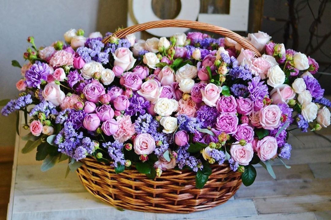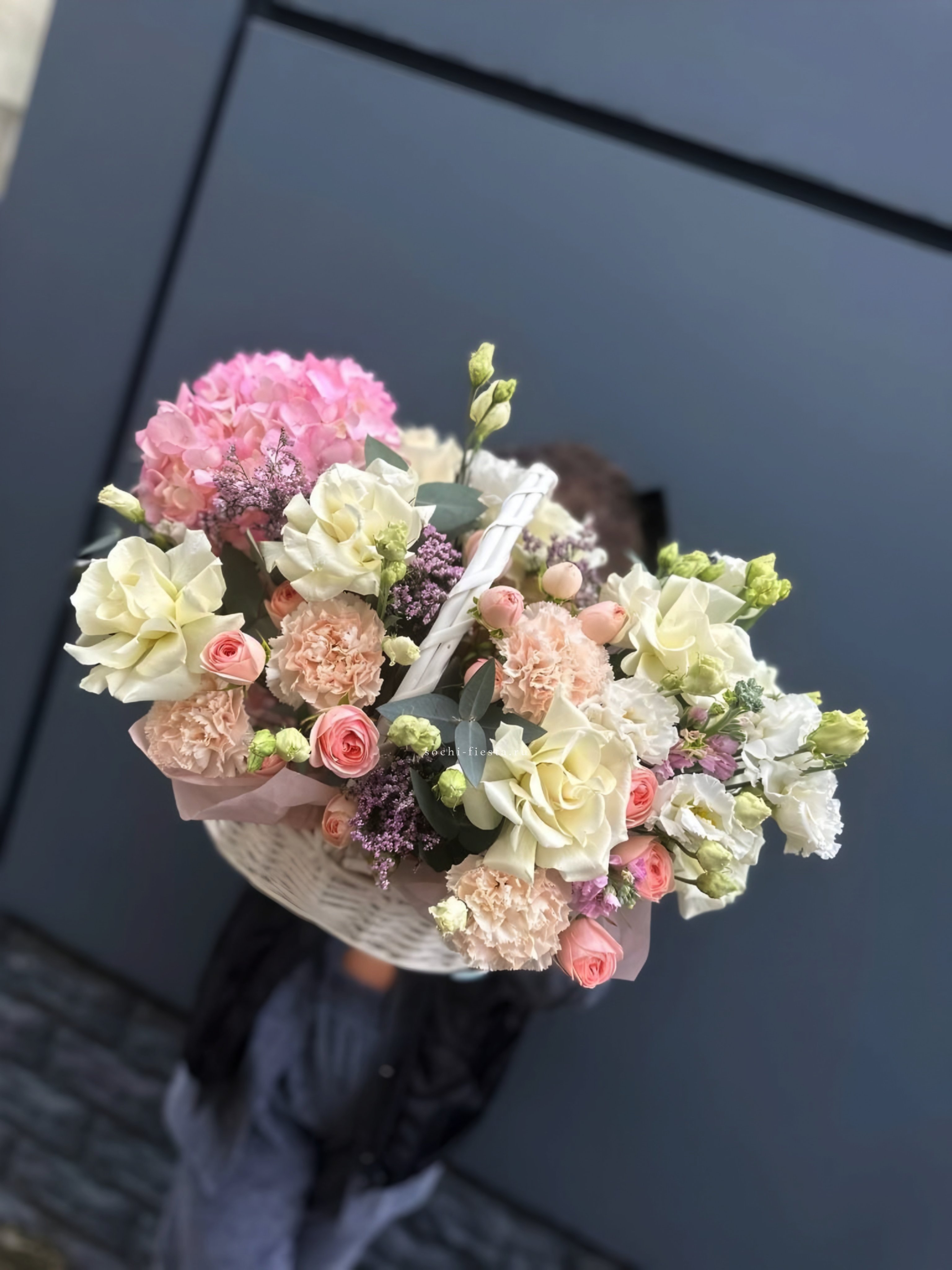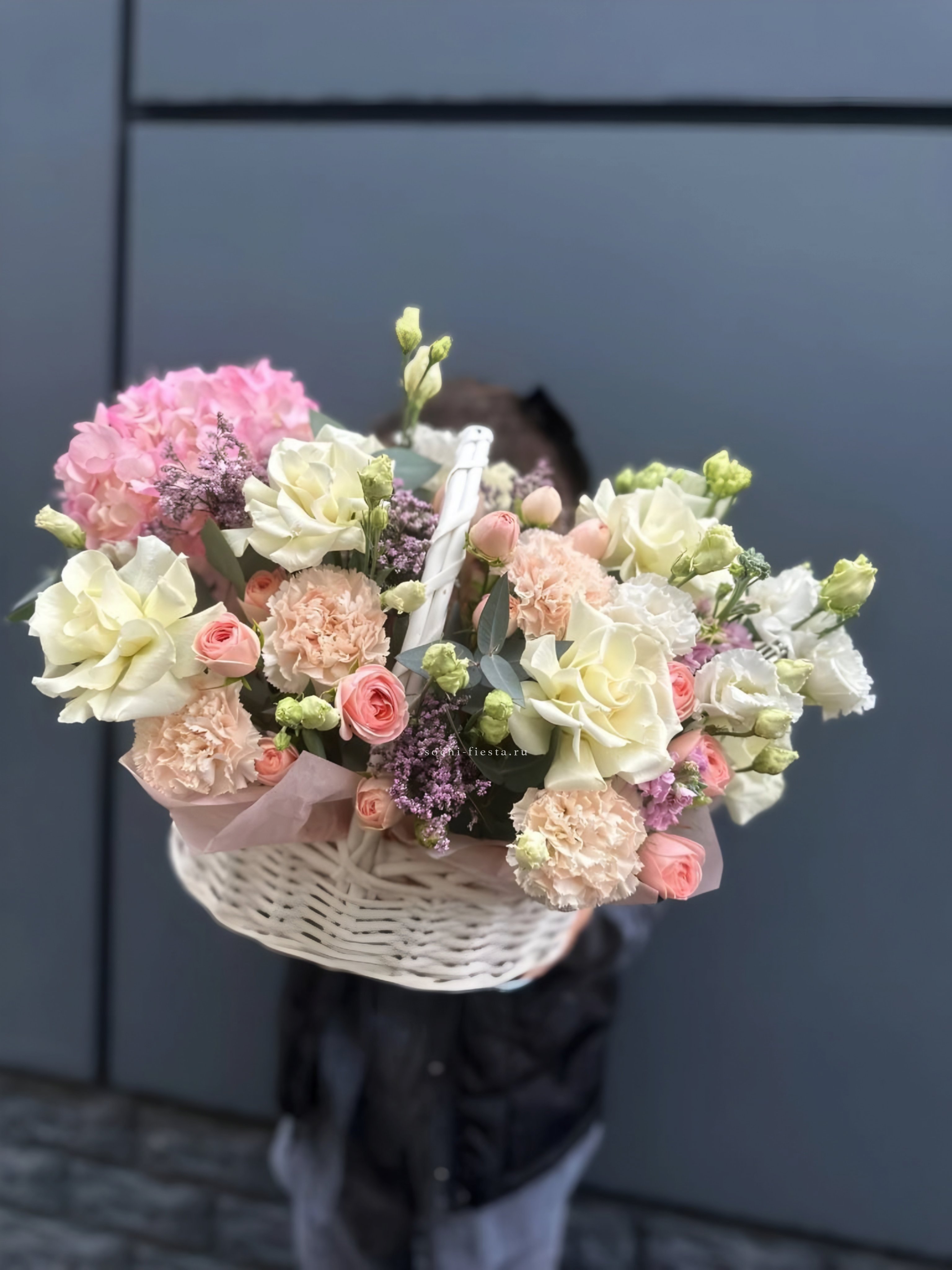 Пышная корзина объединяет пионовидные розы с воздушной гортензией и многослойной эустомой. Матиолла и лимониум добавляют глубину композиции, а диантус создает мягкие переходы между крупными бутонами.